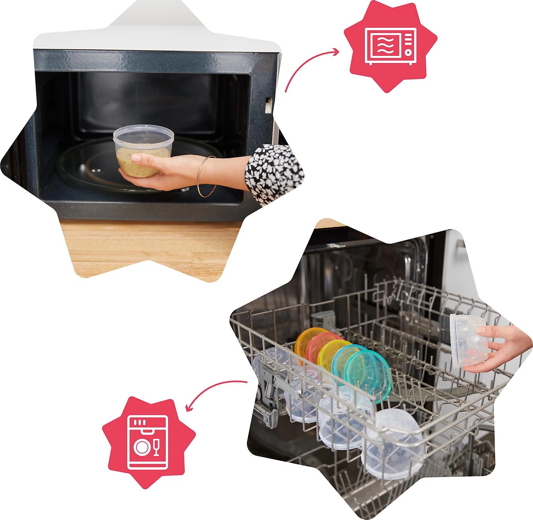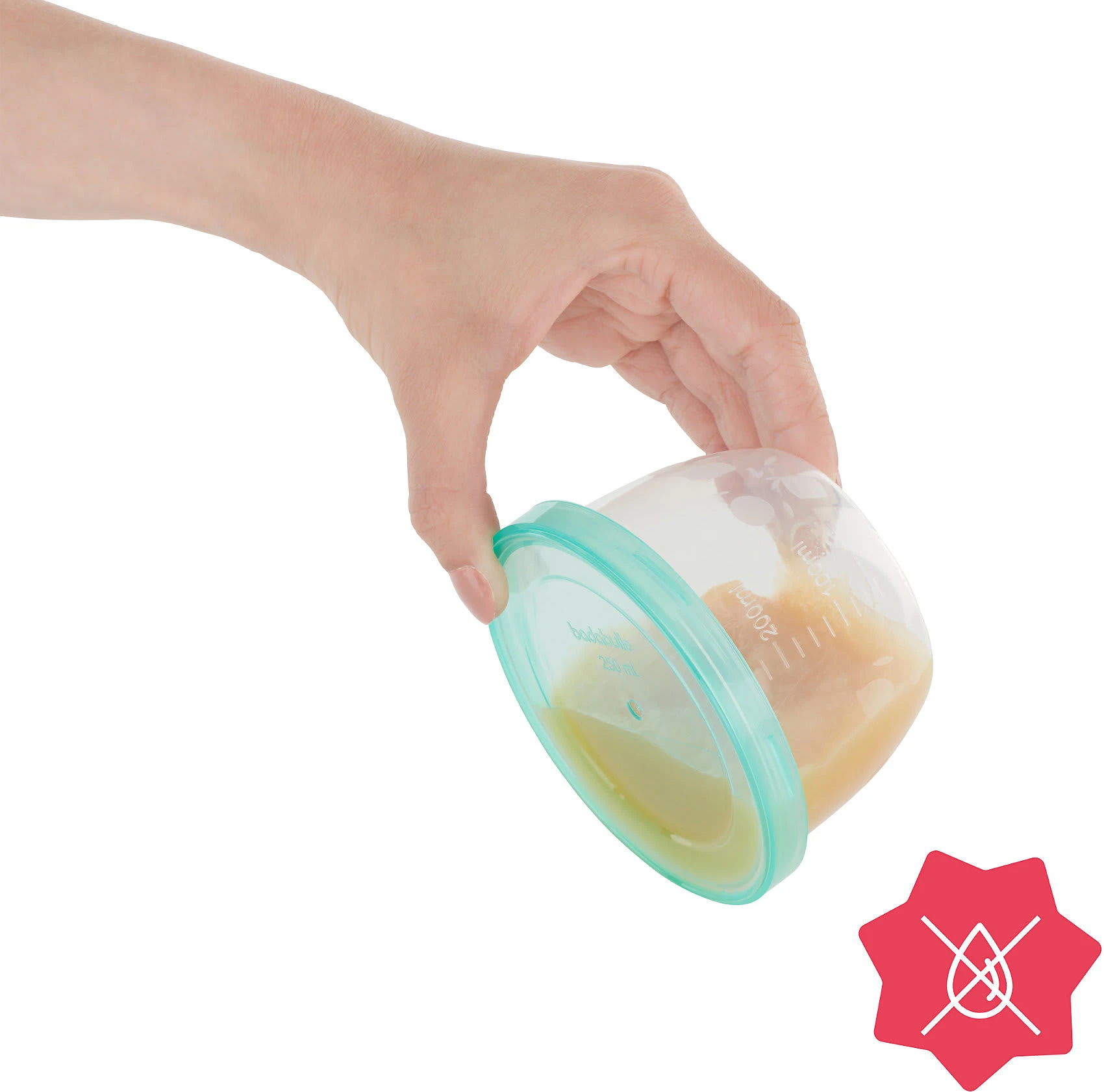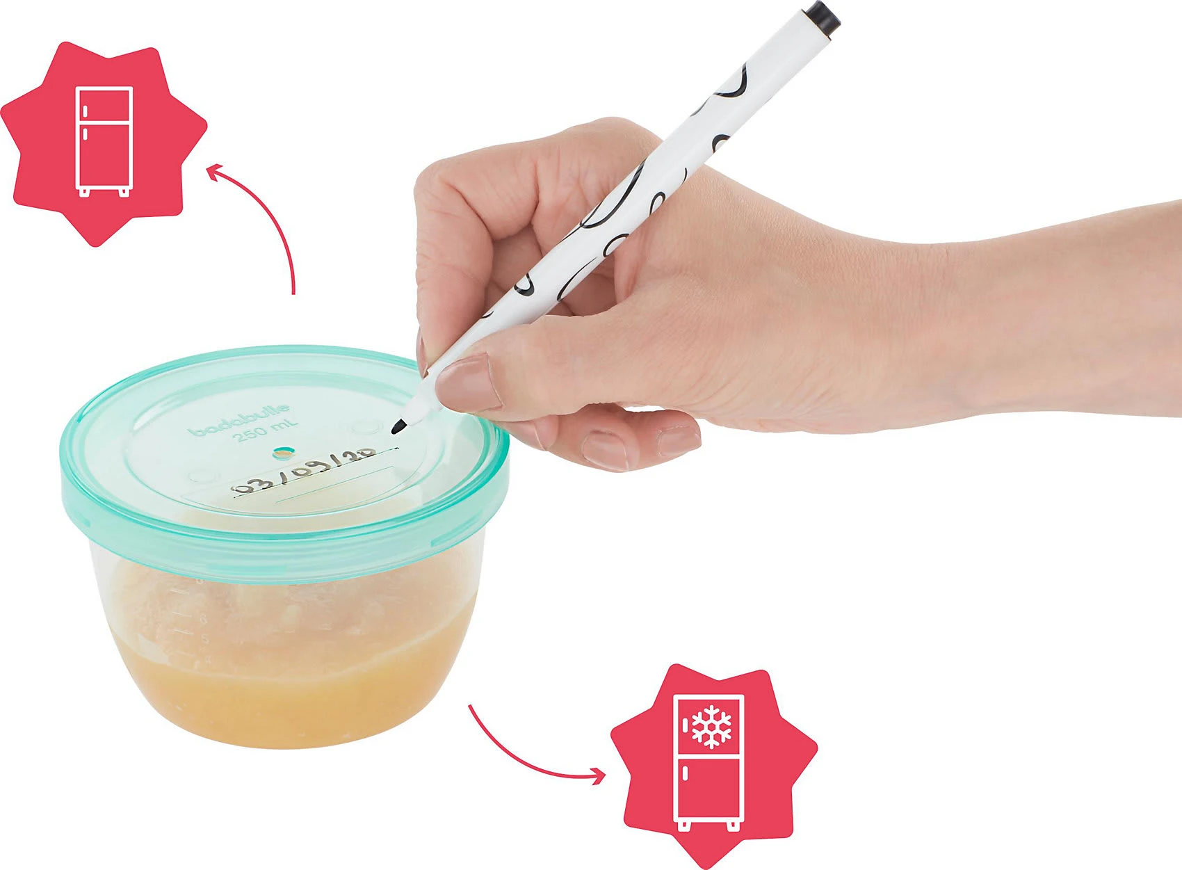 Dieses Set von badabulle besteht aus 12 Schüsseln mit passenden Deckeln, die sich zum Beispiel zum Mitnehmen von Mahlzeiten eignen, wenn man unterwegs ist. Mahlzeiten können in der Schüssel eingefroren oder auch erwärmt werden. Auf dem Deckel können Eltern notieren, bis wann der Inhalt noch haltbar ist, damit sie den Überblick nicht verlieren.