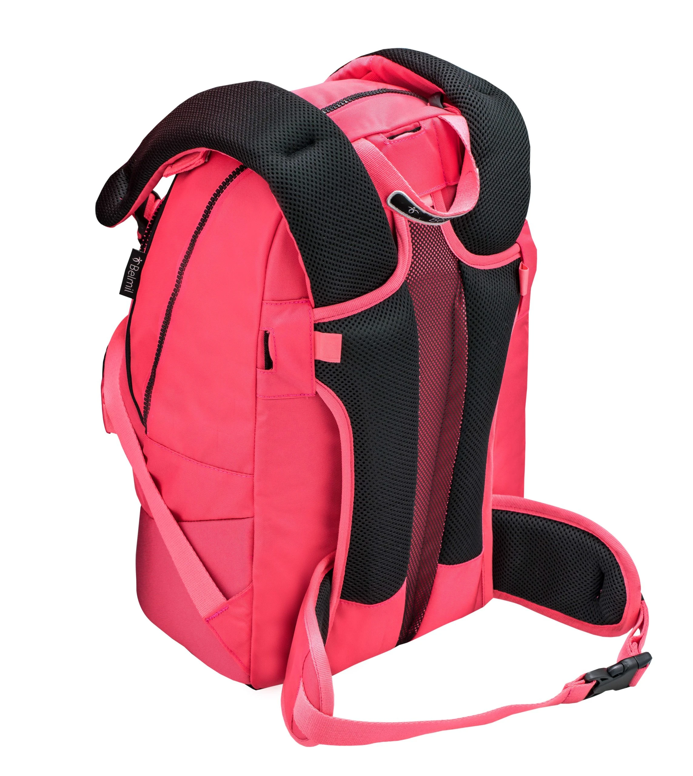 Ein Beckengurt/Hüftgurt mit weich gepolsterten Beckenflossen sowie ein längen- und höhenverstellbarer Brustgurt fixieren den Schulrucksack sicher am Körper