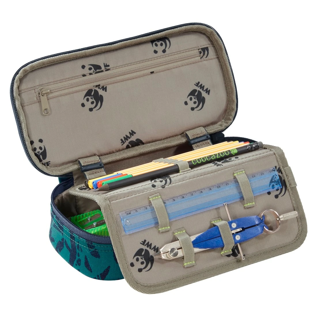Das Mäppchen von Coocazoo bietet viel Platz für sämtliche Schulutensilien. Aufgeteilt ist es in ein großes Hauptfach und ein Reißverschlussfach im Deckel. Die beiden Fächer sind abgetrennt durch einen zusätzlichen Stauraum, für insgesamt sechs Stifte sowie einem extra Bereich für ein Lineal, Geodreieck und Zirkel.