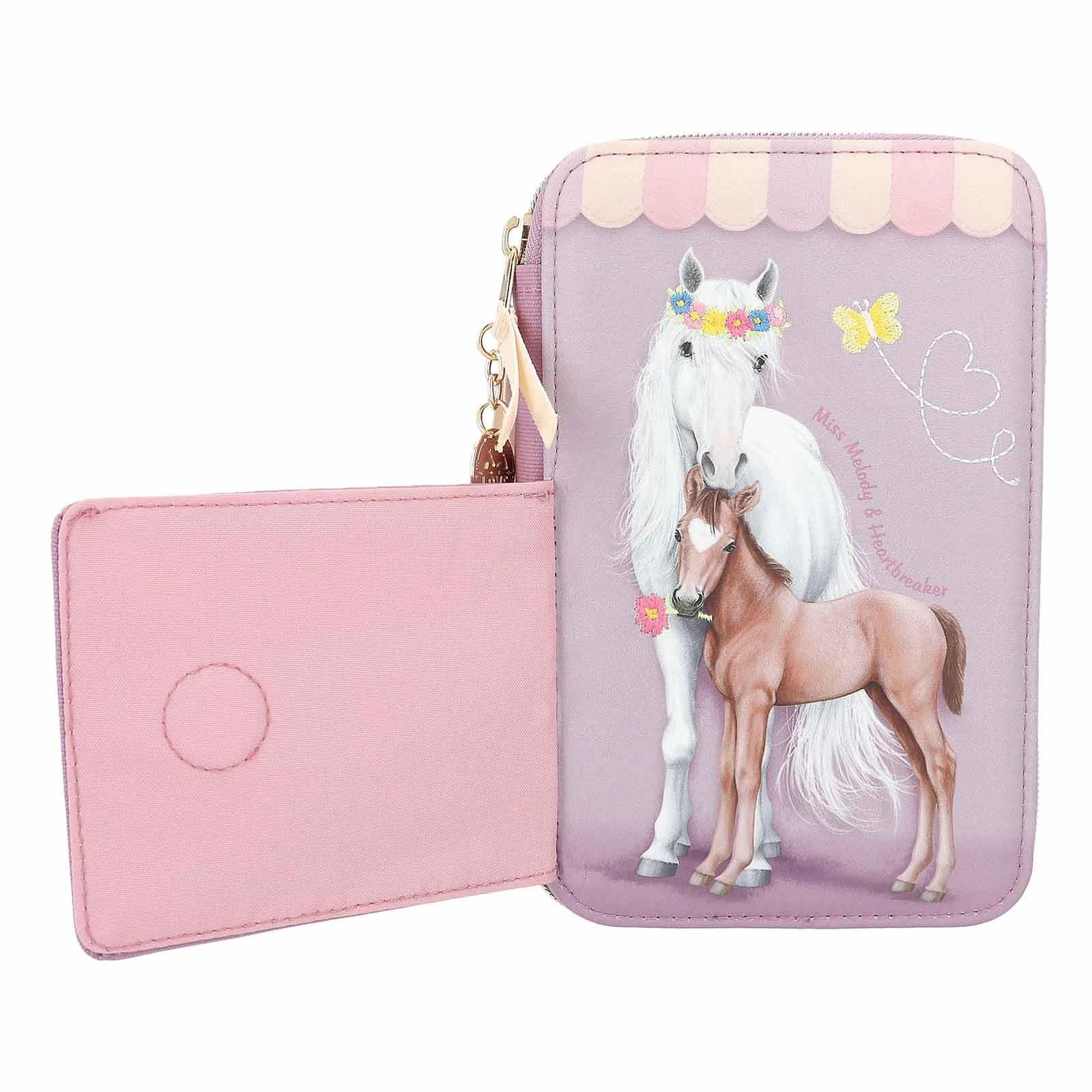 Stall-Feeling auf dem Schreibtisch: Die lila Federtasche von Miss Melody hat ein großes Pferde-Motiv auf der Front, das durch eine aufklappbare Lasche so aussieht, also würden die Tiere in der Pferde-Box stehen. Mit transparentem Namenskartenfach sowie toller Stickerei auf der Front. Süßes Plus: der Münz-Anhänger am Reißverschluss. Die drei separaten Fächer der Federtasche sind komplett gefüllt mit 18 Filzstiften, 18 Buntstiften, 2 Bleistiften, Radierer, Anspitzer, Lineal, Schere, Klebestift und einem kleinen Täschchen mit Klettverschluss.
