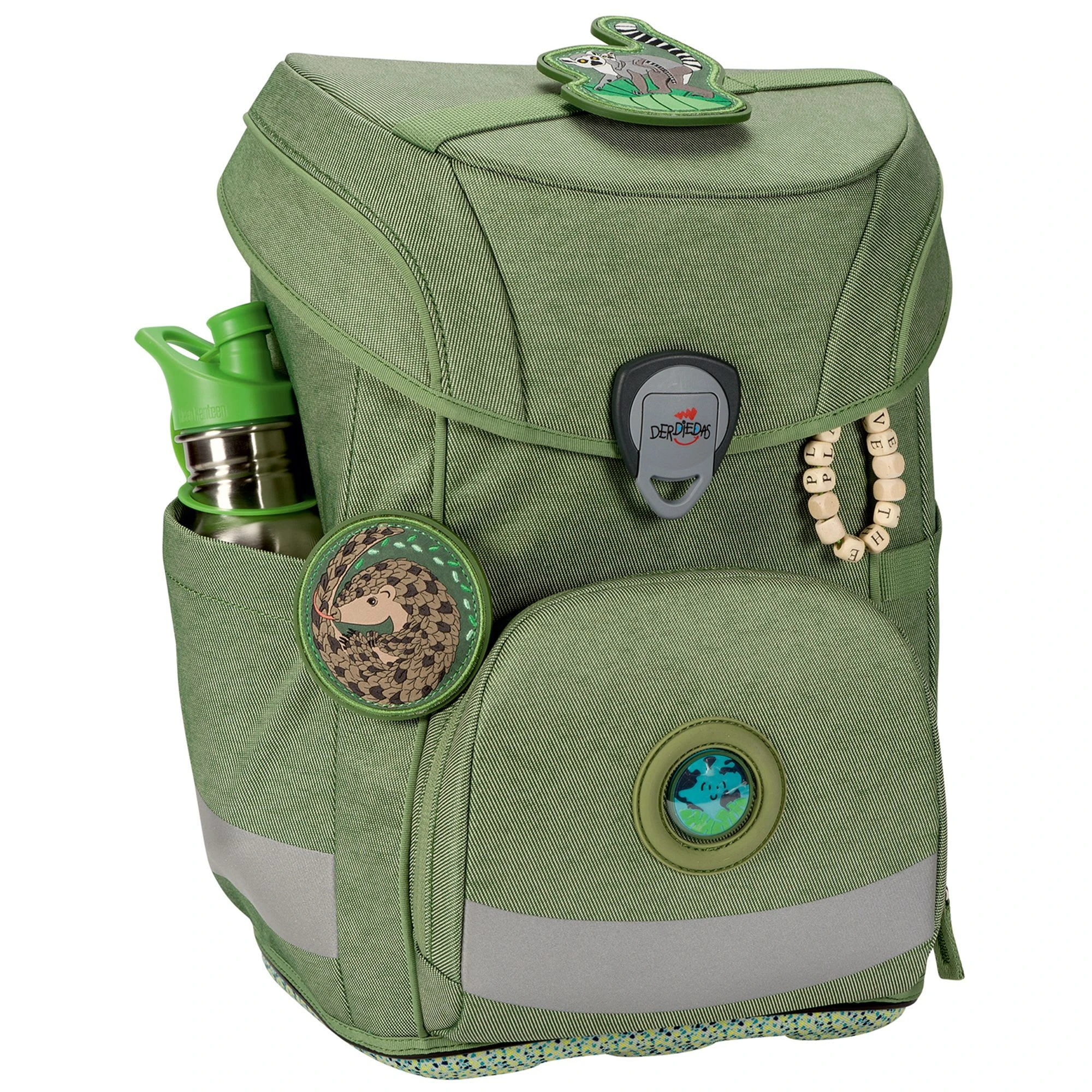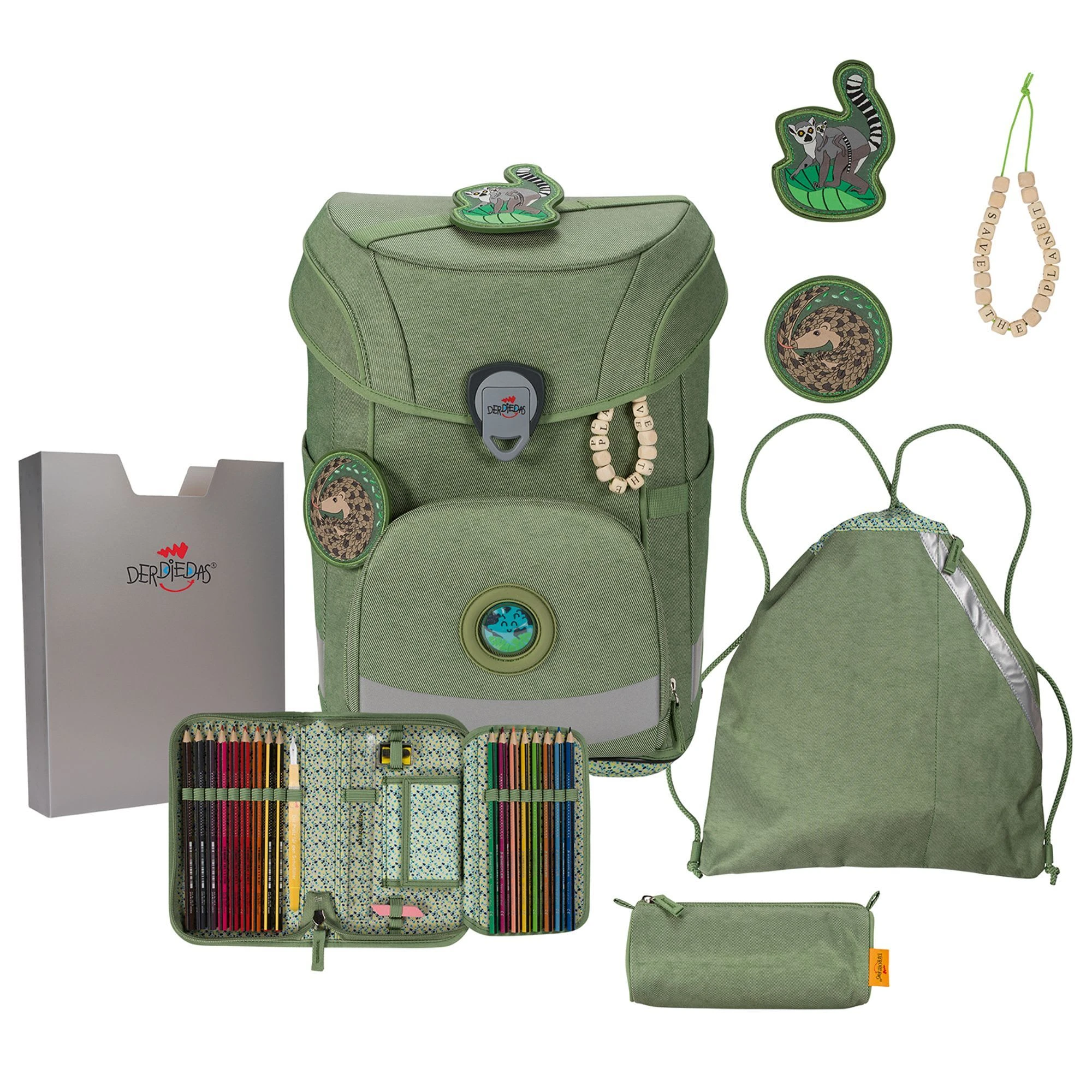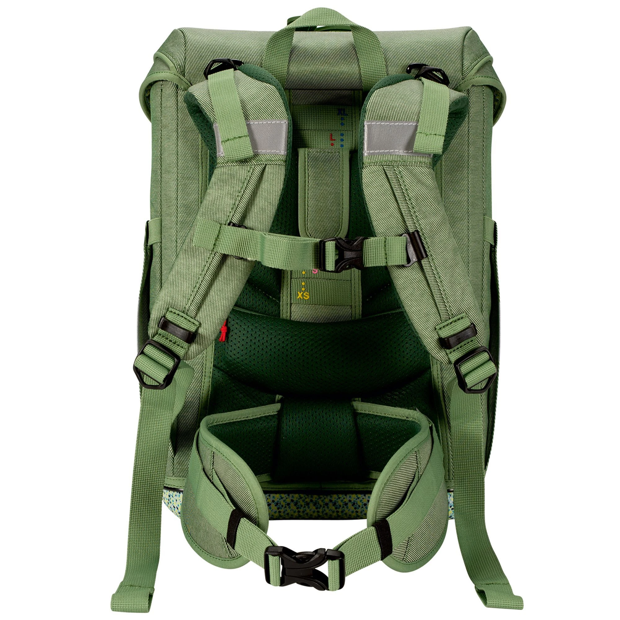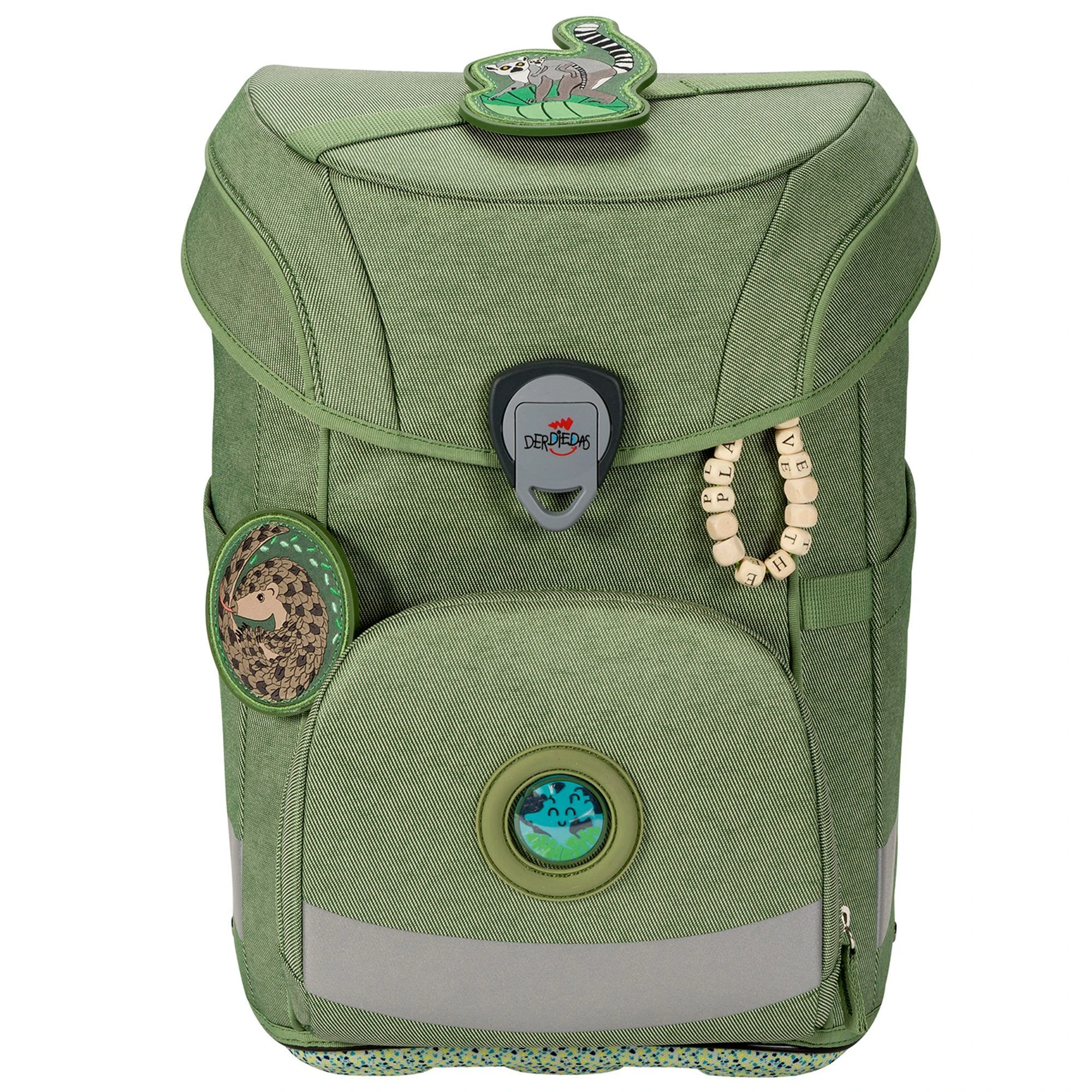 Modischer Schulranzen mit retroreflektierendem an Deckelklappe, Front, Tragegurt und Seitenflächen. Besonderes Highlight des Modells Easy LED ist zum einen das leichte Eigengewicht und zum anderen ist er aus 54% recycelten PET-Flaschen und 46% Bananenfasern hergestellt. Die Schultergurte lassen sich in verschiedenen Stufen auf die passende Größe Ihres Kindes verstellen. Durch das 5tlg. Set ist das Kind perfekt für den Schulalltag ausgestattet. Das Set besteht aus: Schulranzen (inkl. 2 Buttons und Anhänger), Sportbeutel, gefülltem Schüleretui, Hefte Box und Schlampermäppchen.