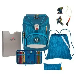 Modischer Schulranzen in toller Optik und super leichtem Gewicht von nur 650 g. Durch das 5tlg. Set ist das Kind perfekt für den Schulalltag ausgestattet. Das Set besteht aus: Schulranzen, Sportbeutel, gefülltem Schüleretui, Hefte Box, Schlampermäppchen, und austauschbare Buttons.