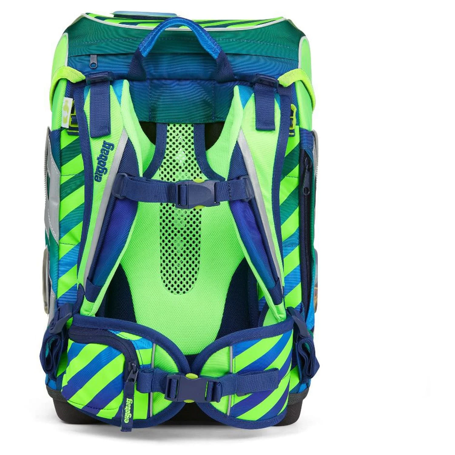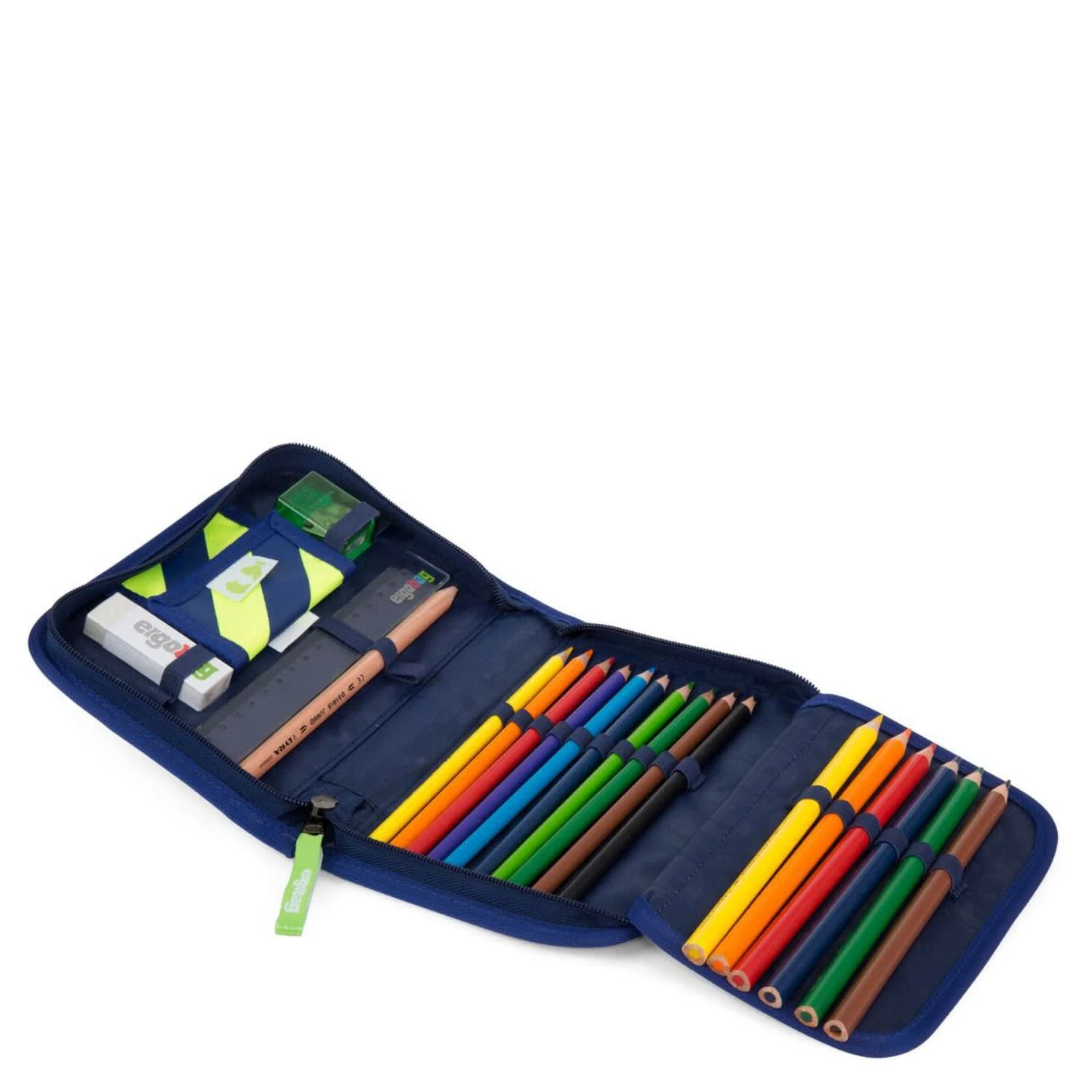 Sportrucksack Kann wie ein Rucksack getragen oder einfach am Schulrucksack fixiert werden. FedermäppchenBestens ausgestattet (22-tlg.), finden neben 17 Stiften in Reih und Glied auch Radiergummi, Lineal, Spitzer und Stundenplan ihren Platz.Klettie-SetMit Kletties lässt sich der ergobag individuell gestalten.