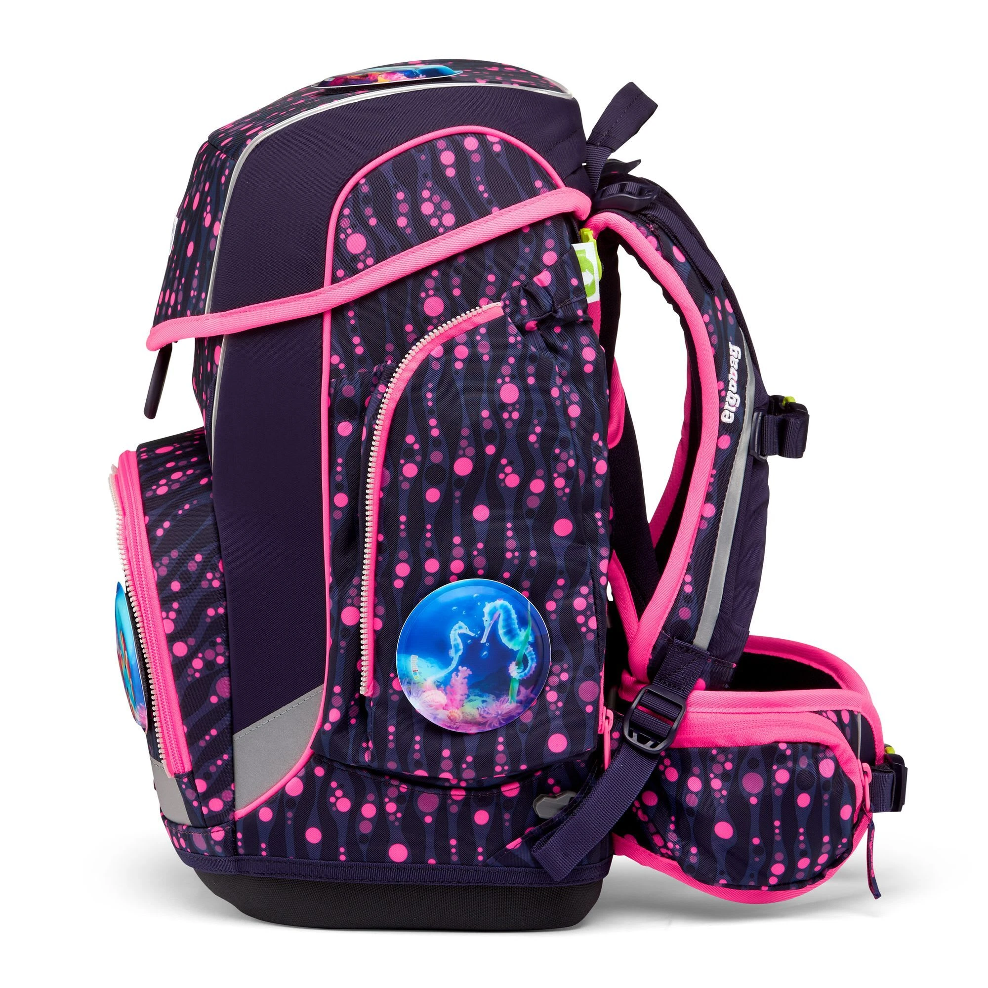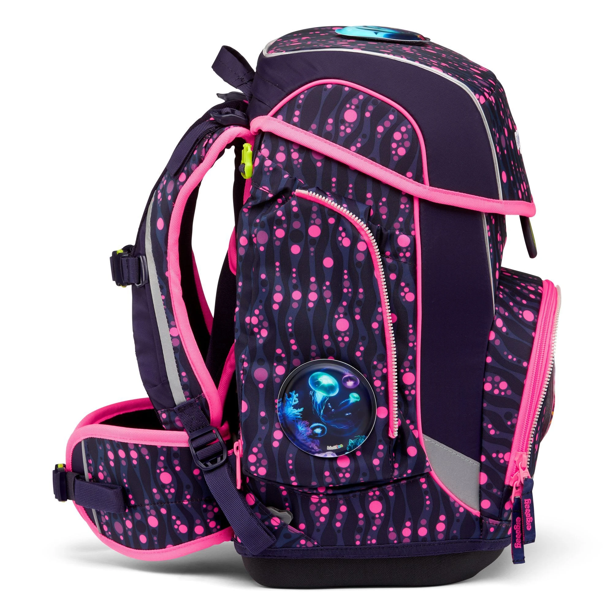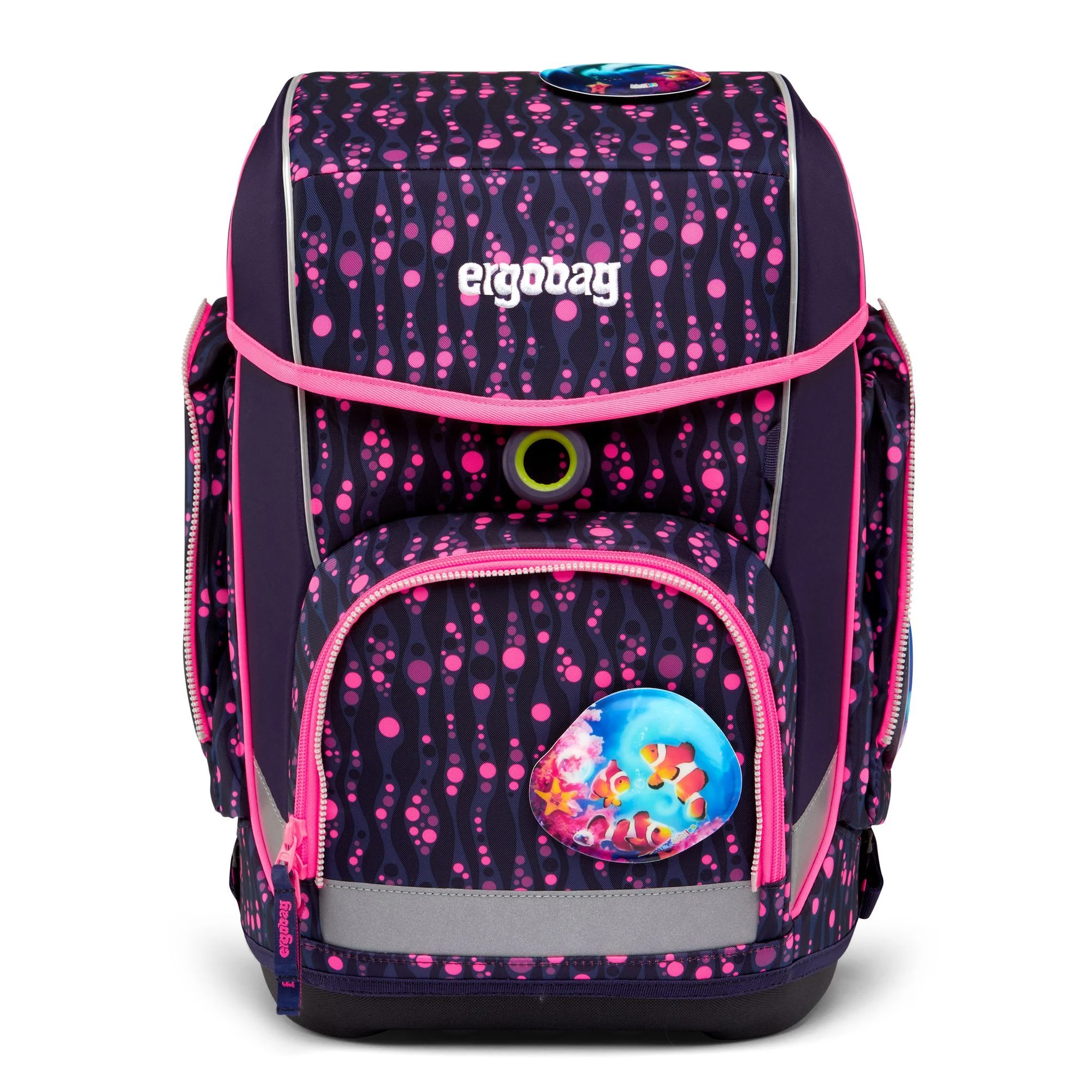 5-teiliges Schulranzen-Set von Ergobag bestehend aus Schulranzen, Sportbeutel, Schlampermäppchen, Federmäppchen (22-tlg.) und 5-tlg. Kletties-Set.