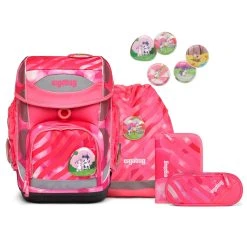 5-teiliges Schulranzen-Set von Ergobag bestehend aus Schulranzen, Sportbeutel, Schlampermäppchen, Federmäppchen (22-tlg.) und 5-tlg. Kletties-Set.