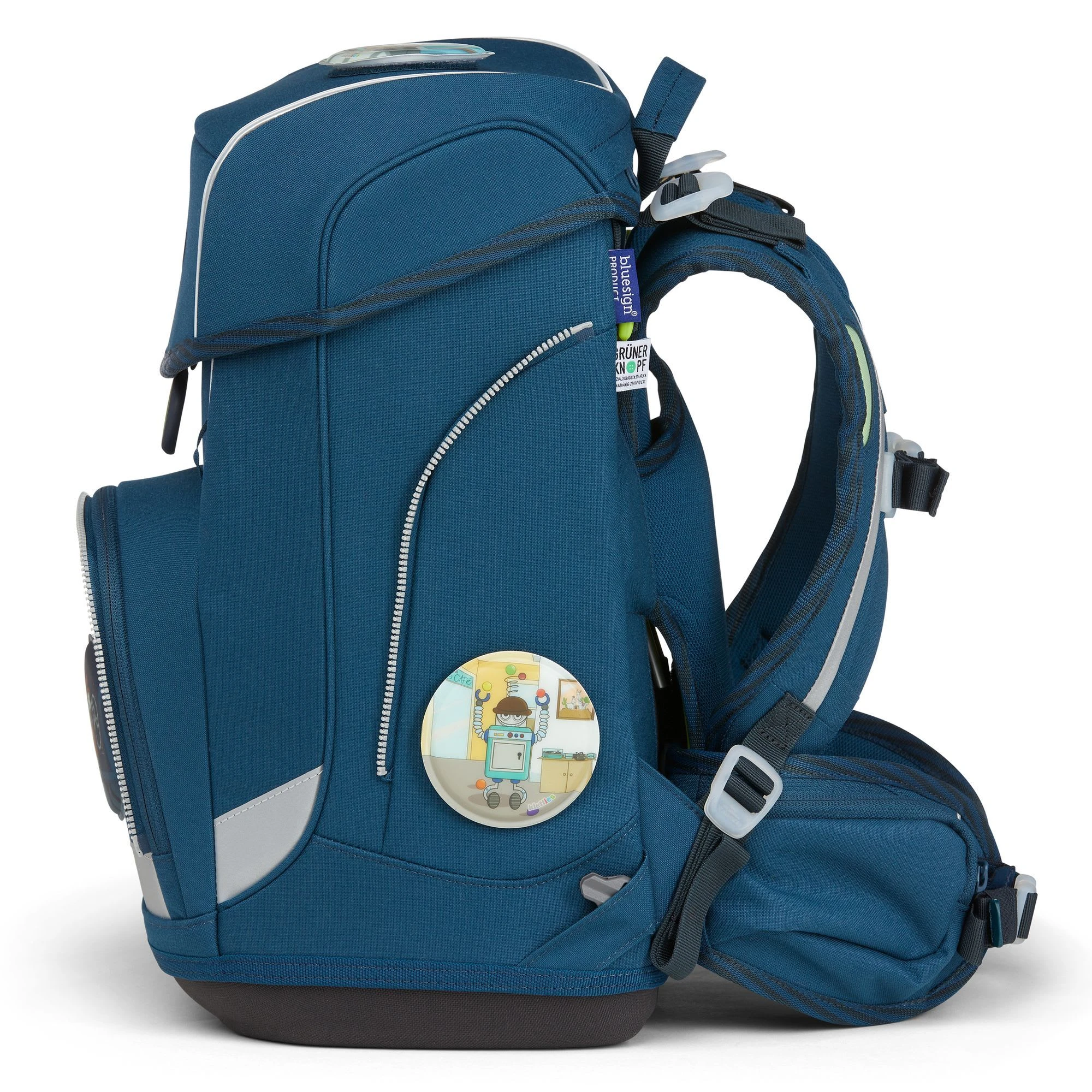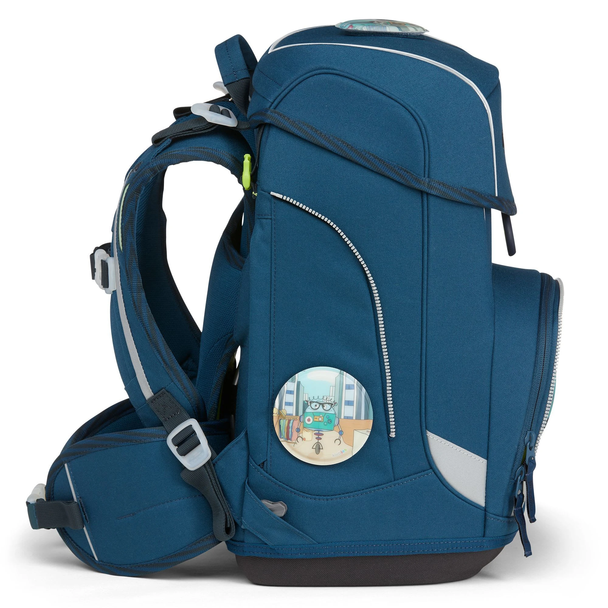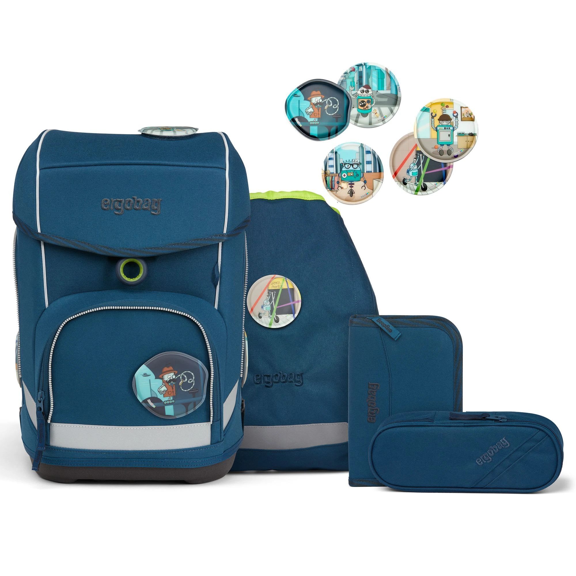 5-teiliges Schulranzen-Set von Ergobag aus “Galaxy Glow”-Edition, bestehend aus Schulranzen, Sportbeutel, Schlamperrolle, 22-tlg. Schlampermäppchen und 5-tlg. Klettie-Set. Der ergobag Cubo Schulranzen ab der 1. Klasse ergonomisch, individuell, nachhaltig und sichtbar. Der cubo von ergobag kombiniert die klassische Form traditioneller Schulranzen mit dem Tragesystem des beliebten ergobag-Schulrucksacks. Dank breiter Beckenflossen wird das Gewicht von den Schultern auf den stabilen Beckenbereich verlagert. Die Kletties bieten, wie bei ergobag beliebt, individuell den cubo zu gestalten. Ergobag benutzt für die Herstellung des Ranzens recycelte PET-Flaschen um die Umwelt zu schützen, für diesen Ranzen wurden 24 Flaschen (0,5l) verarbeitet. An den cubo Schulranzen können die passenden Sicherheitsset, für noch mehr Sicherheit im Straßenverkehr zusätzlich erworben werden. Er hat einen standfesten Boden. Bewegung und Haltung beeinflussen unser Körperbewusstsein und können die Persönlichkeitsentwicklung fördern. Studien zeigen, dass Kinder, die sich viel bewegen, unabhängiger, kontaktfreudiger und motivierter sind. Der Ranzen unterstützt die Bewegungsfreiheit der kleinen Träger, denn er sitzt durch Becken- und Brustgurt angenehm nah am Rücken, sogar beim Herumtoben. Schulranzen Außenmaß: 25 cm x 20 cm x 40 cm / Gewicht: ca. 1.100 g / Volumen: ca.19 l