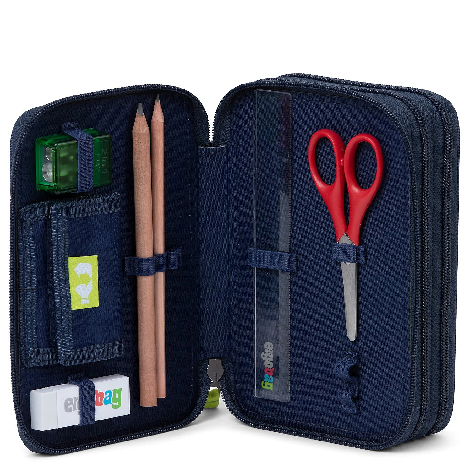 Cleverer Begleiter: In dieses ergobag-Federmäppchen mit 3 Fächern passen garantiert alle Lieblingsfarben – ob als Bunt- oder Filzstift! Neben einem Radiergummi, Lineal, Bleistift und Spitzer beinhaltet das Mäppchen ein Klettverschlussfach für Kleingeld oder andere Kleinigkeiten.