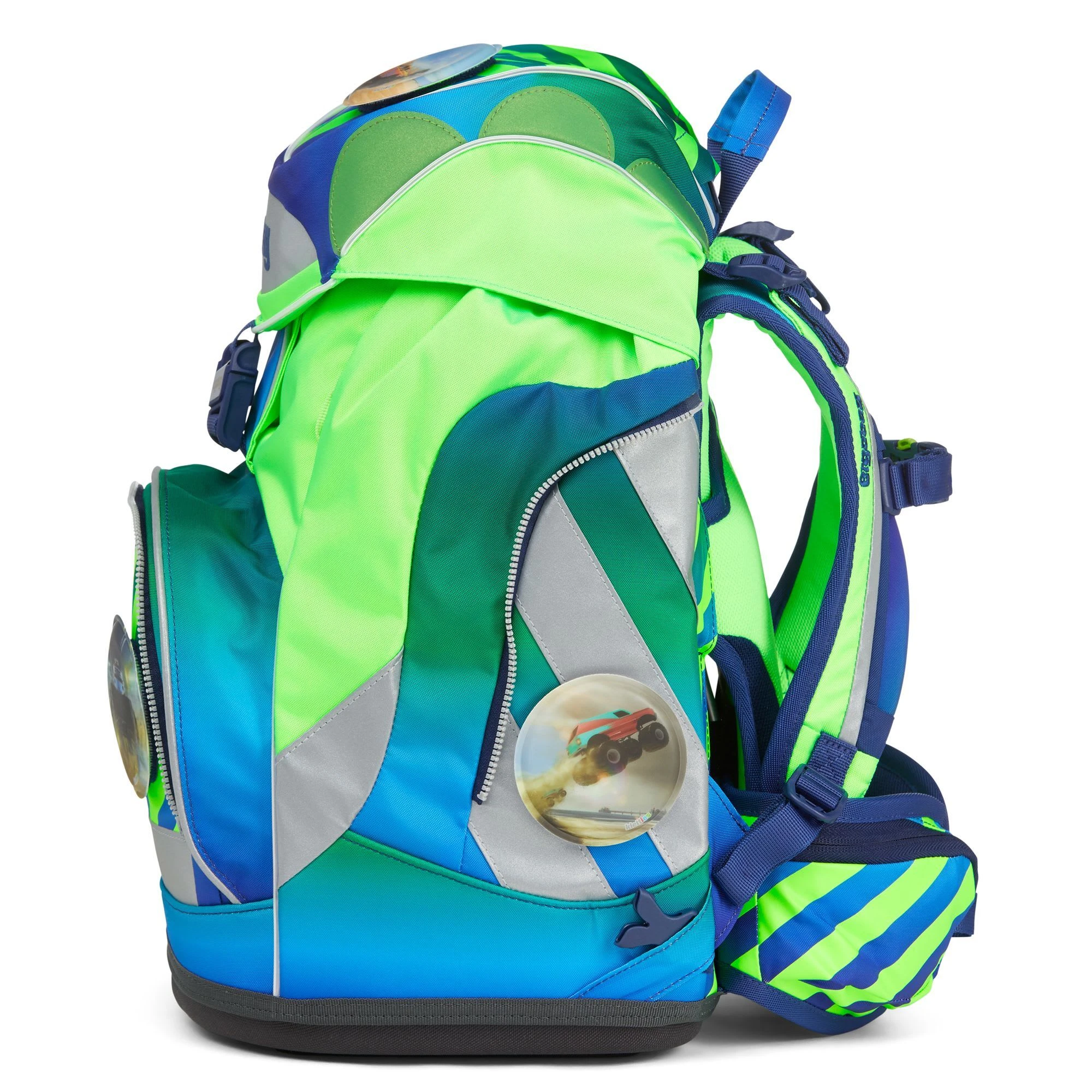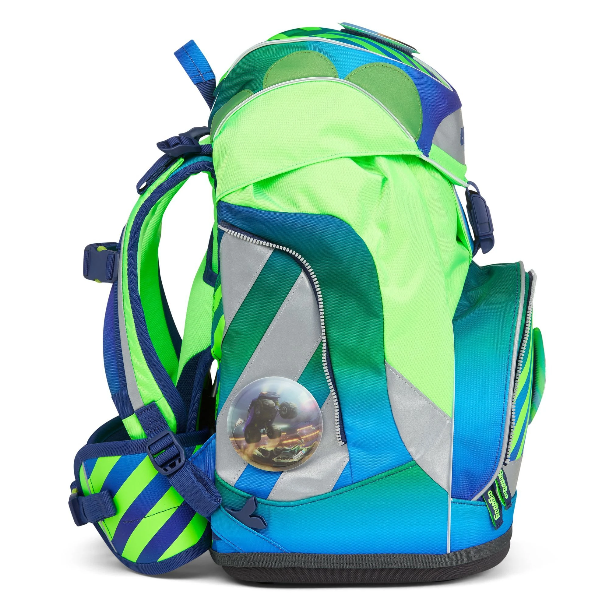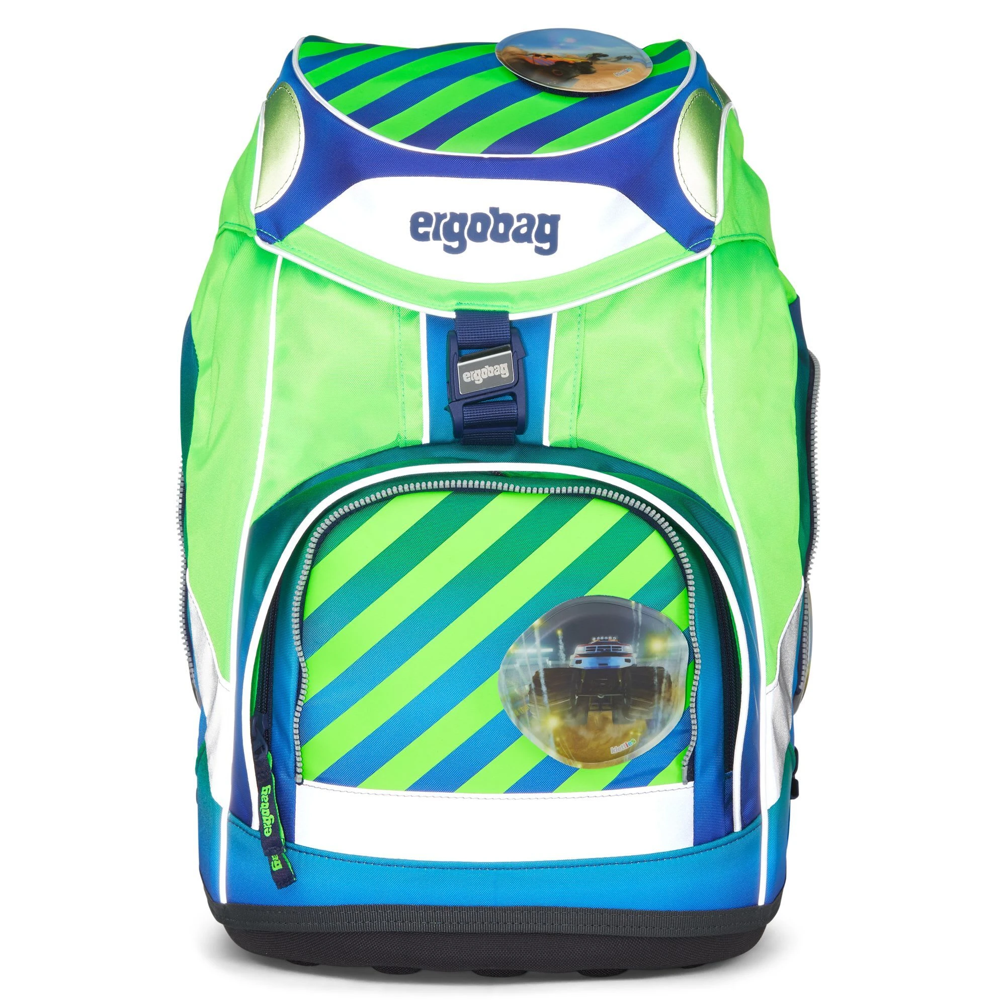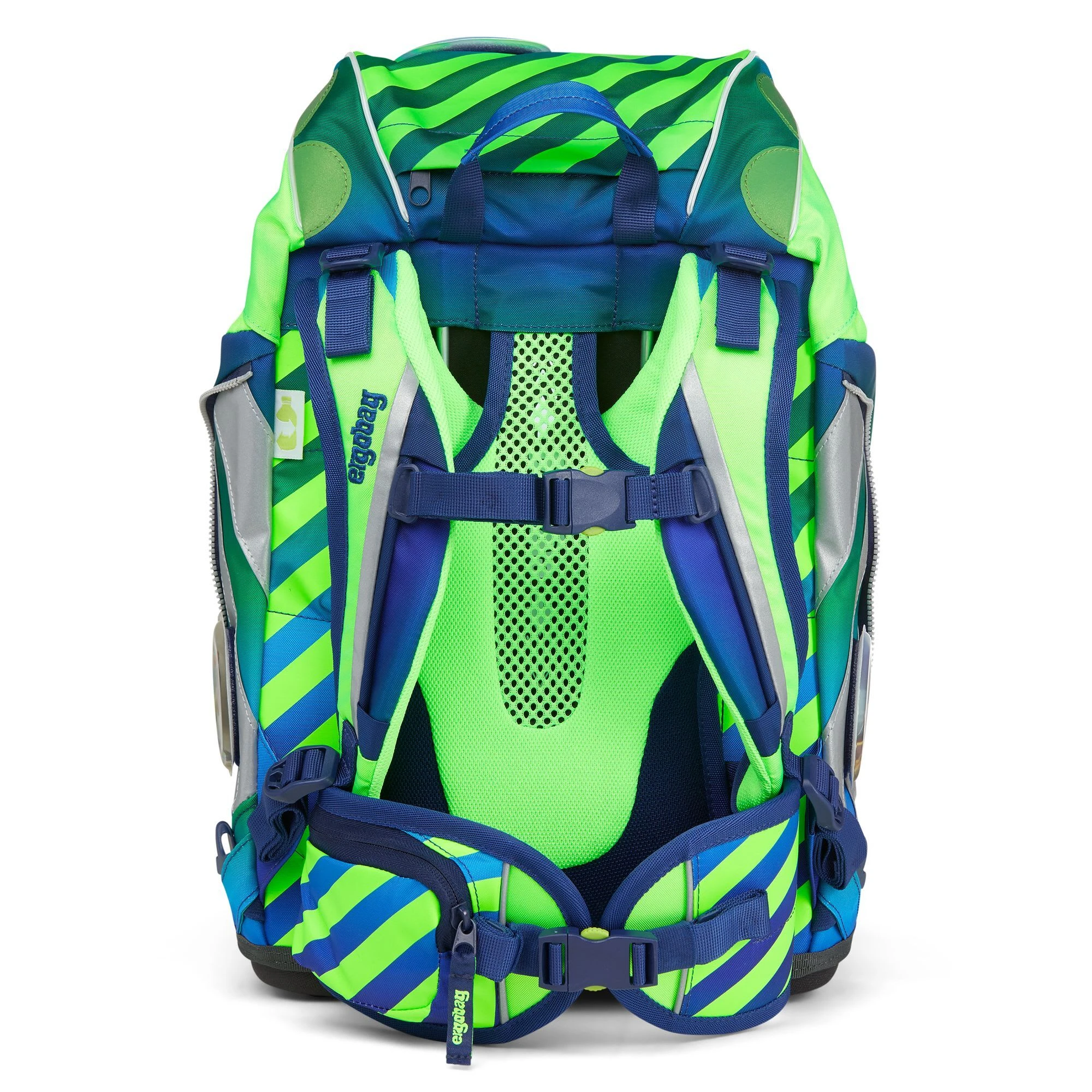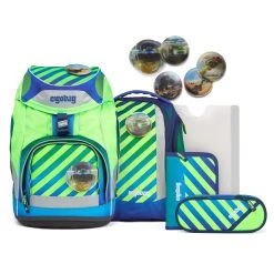 Der Ergobag Pack Schulranzen ab der 1. Klasse ergonomisch, individuell, nachhaltig und sichtbar. Der Pack von ergobag kombiniert die klassische Form traditioneller Schulranzen mit dem Tragesystem des beliebten ergobag-Schulrucksacks. Dank breiter Beckenflossen wird das Gewicht von den Schultern auf den stabilen Beckenbereich verlagert. Die Kletties bieten, wie bei ergobag beliebt, individuell den cubo zu gestalten. Ergobag benutzt für die Herstellung des Ranzens recycelte PET-Flaschen um die Umwelt zu schützen, für diesen Ranzen wurden mehrere Flaschen verarbeitet. An den cubo Schulranzen können die passenden Sicherheitsset, für noch mehr Sicherheit im Straßenverkehr. Er hat einen standfesten Boden. Bewegung und Haltung beeinflussen unser Körperbewusstsein und können die Persönlichkeitsentwicklung fördern. Studien zeigen, dass Kinder, die sich viel bewegen, unabhängiger, kontaktfreudiger und motivierter sind. Der Ranzen unterstützt die Bewegungsfreiheit der kleinen Träger, denn er sitzt durch Becken- und Brustgurt angenehm nah am Rücken, sogar beim Herumtoben. Set bestehend aus: – Schulranzen – Sportrucksack – Schlampermäppchen – Federmäppchen – Kletties 1 – Heftbox. Schulranzen Größe: 25cm x 20cm x 40cm Gewicht: ca. 1.100 g Volumen: ca. 20 Liter Beckengurt mit Beckenflossen höhenverstellbarer Brustgurt atmungsaktives Rückenpolster ( Rücken wächst mit) Mit ergobag Kletties lässt sich der Cubo individuell gestalten er hat seitliche Reißverschlussfächer ein Fach im Deckel individuell einstellbare Innenaufteilung Die ergobag Stoffe aus 100% recycelten PET Flaschen hergestellt. Diese Produktionsweise verringert die Umweltbelastungen enorm. Im Vergleich werden in der Herstellung die Abwassermenge um 20%, der Energieverbrauch um 50% und die Schadstoffemissionen um 60% gesenkt 2. Sportrucksack Er kann durch Schnappverschlüsse am Schulranzen fest fixiert oder separat getragen werden. 3. Schlamperrolle 4. Federmäppchen gefüllt 22-tlg. 5. Kletties