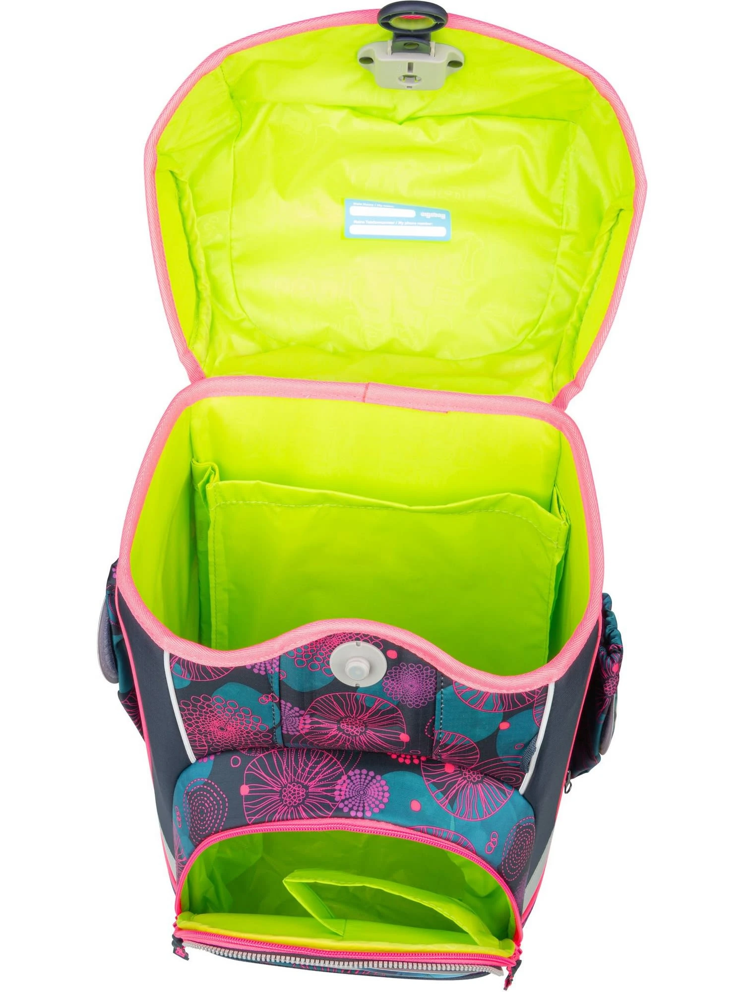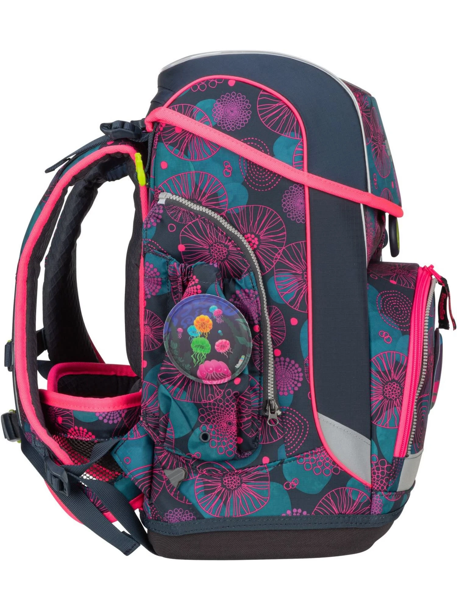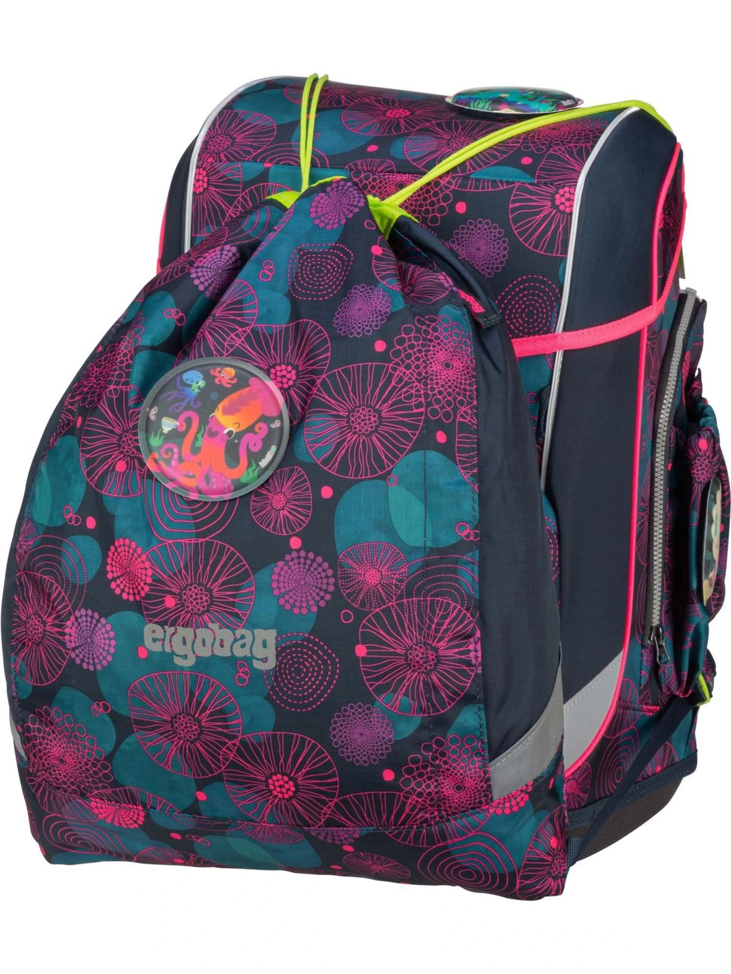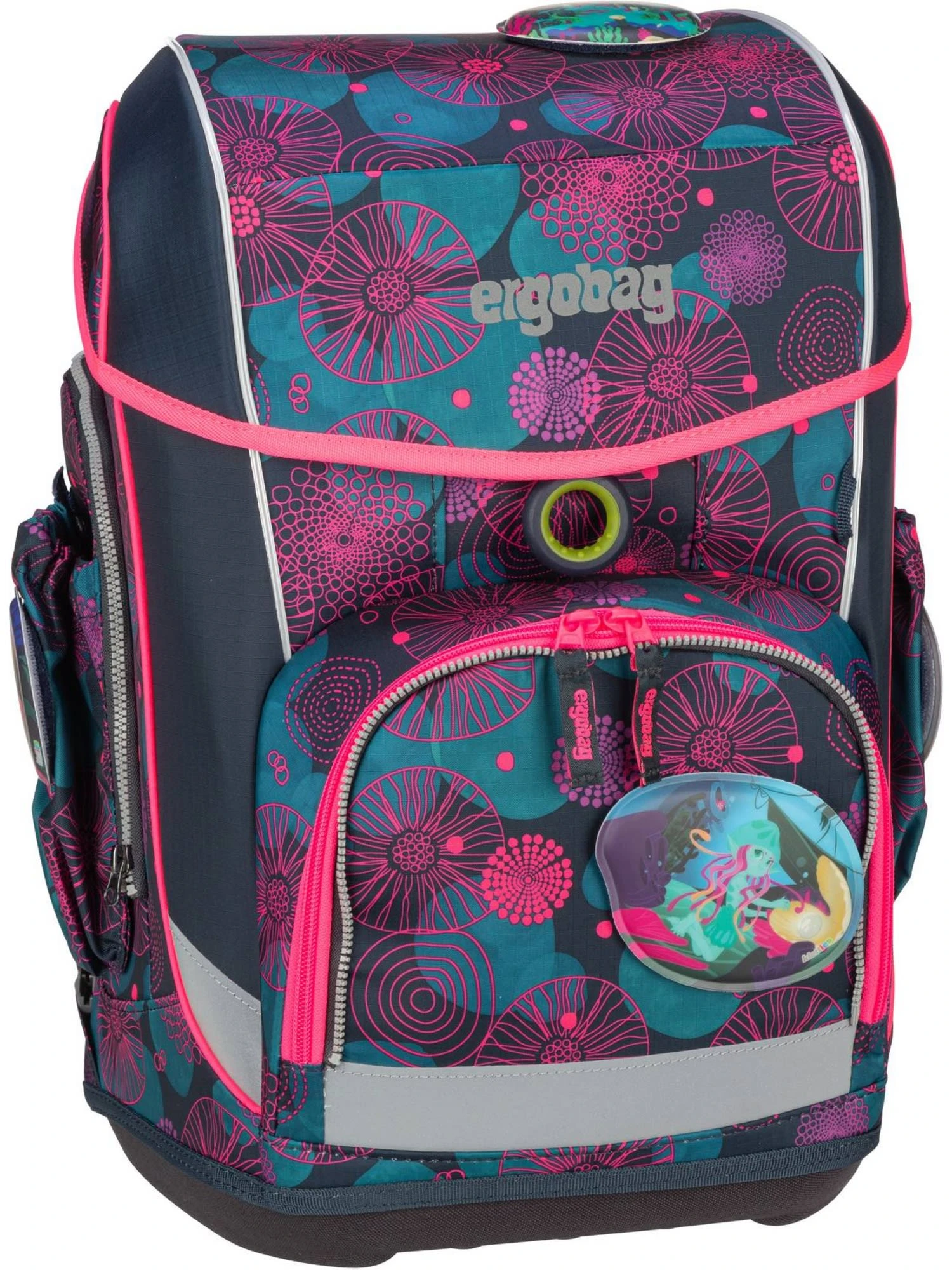 Der praktische Schulranzen von ergobag überzeugt Sie und Ihre Kinder mit reflektierenden Details, einem großen Hauptfach und einer tiefen Fronttasche mit Flaschenhalterung.