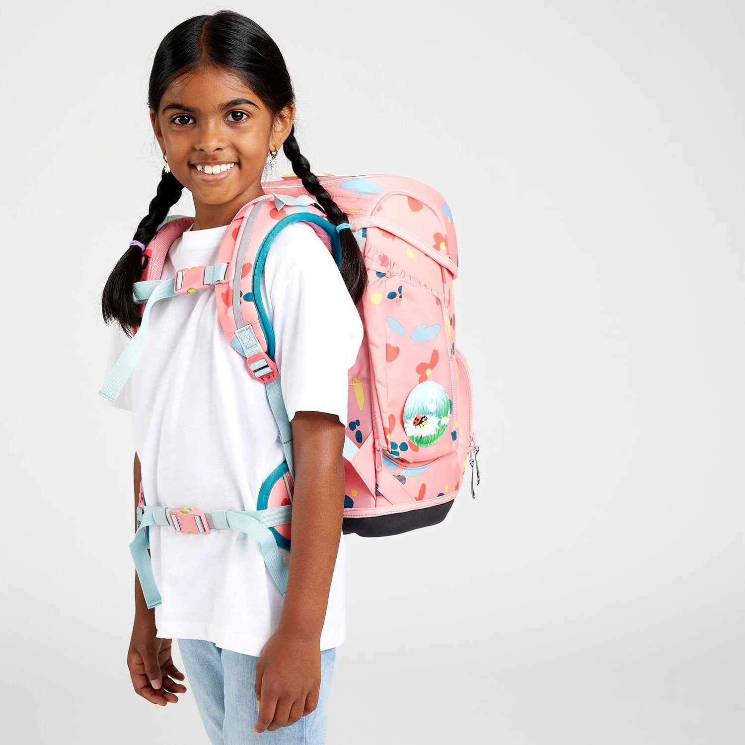 Für einen angenehmen Tragekomfort wurde ein atmungsaktives Rückenpolster verbaut, welches sich optimal an den Körperbau des Kindes anpasst. Durch das höhenverstellbare „Your-Size-System“, kann jedes Modell an die Größe Ihres Kindes angepasst werden (1 m – 1,50 m). Der Rucksack verfügt über integrierte Seitentaschen, an der rechten und linken Außenseite. Ebenfalls sind hier noch Reißverschlüsse für Zip-Sets angebracht. Ausgestattet ist der Pack mit einem extra Regencape-Fach und einer Tasche im Deckel des Ranzens.