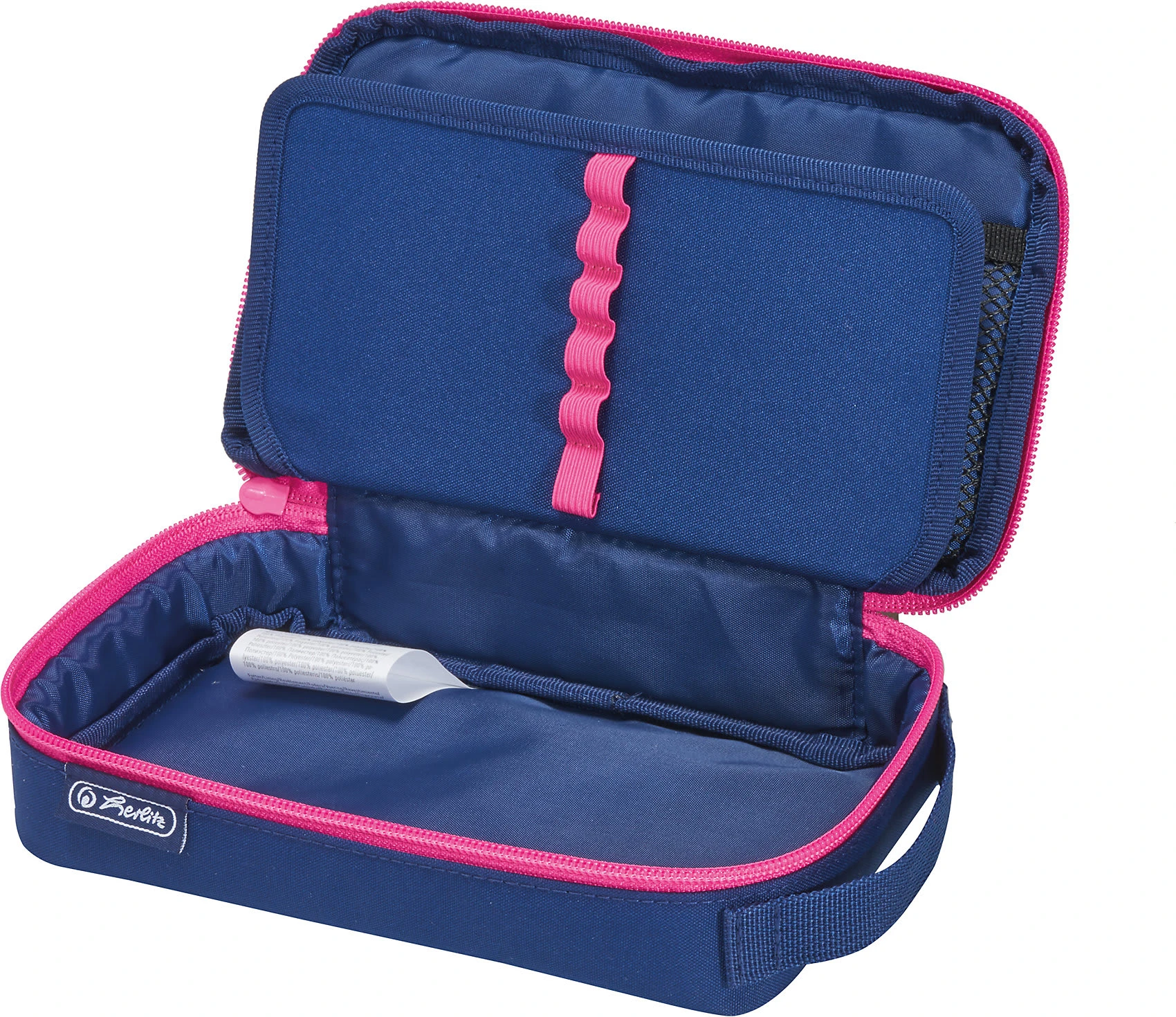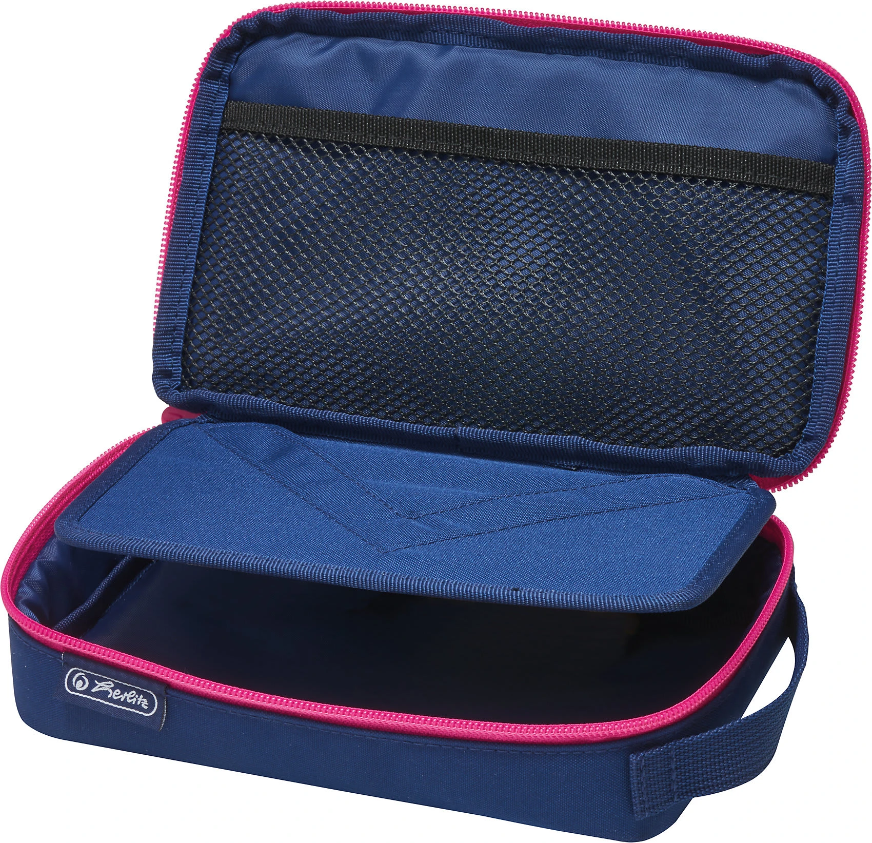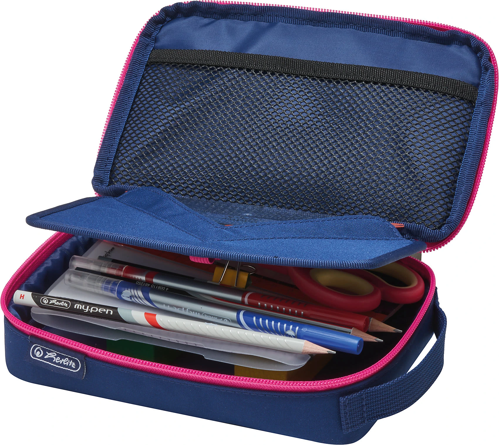 Diese coole Etuibox 2 Go von herlitz ist der optimale Begleiter durch den Schulalltag. Das Hauptfach schließt mit einem farblich abgesetzten Reißverschluss und bietet im Inneren eine sinnvolle Aufteilung. Im Mitteldeckel sind elastische Schlaufen für die Stifte-Sortierung angebracht und im Deckel findet sich ein Mesh-Innenfach.