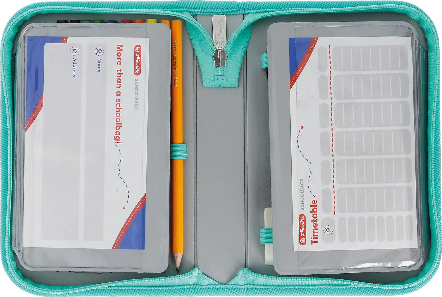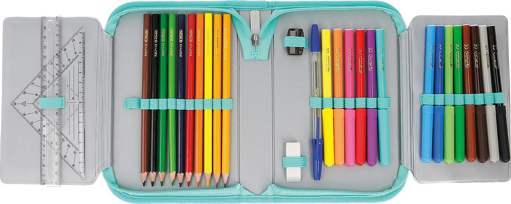 Ideal für Tier-Fans: dieses Federmäppchen Cute Animals von herlitz begeistert mit einem tollen Tier-Print und bietet Platz für alle nötigen Schreibutensilien. Innen ist das Mäppchen mit zwei klappbaren Seitenteilen ausgestattet, die auf der einen Seite mit Einschubfächern für den Stundenplan ausgestattet sind. Für die Stifte und die Ordnung ist mit den elastischen Bändern gesorgt. Die Zipper an den Reißverschlüssen haben Zugschlaufen. Das erleichtert das Öffnen und Schließen. In dem Set ist alles enthalten was für einen guten Start in die Schulzeit nötig ist.