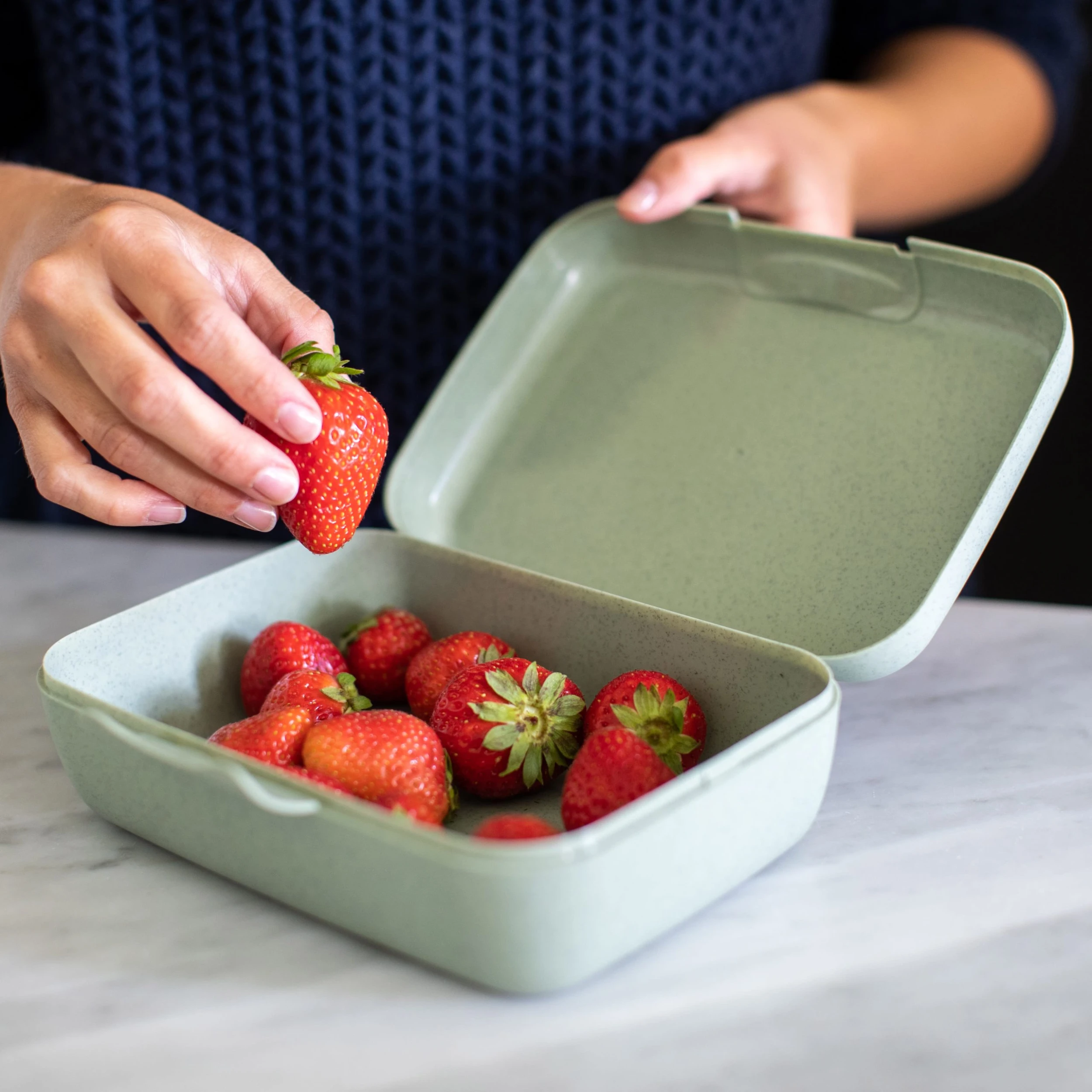 In der geräumigen Lunchbox CANDY L sind Brote, Snacks, Obst und sogar belegte Brötchen frisch und appetitlich aufbewahrt. Der Clipverschluss ist in der Form versenkt, so dass sich die Dose beim Transport nicht versehentlich öffnen kann. Die abgerundete Form ist ein haptisches Vergnügen und vermeidet lästiges Anecken beim Transport in der Tasche, im Rucksack oder im Auto. •voluminöse Lunchbox •mit Clipverschluss •ideal auch für Obst•der praktische Begleiter für Büro, Schule und Ausflüge•ideale Kombination mit CANDY S•100% CO2-neutral KOZIOL THERMOPLASTIC