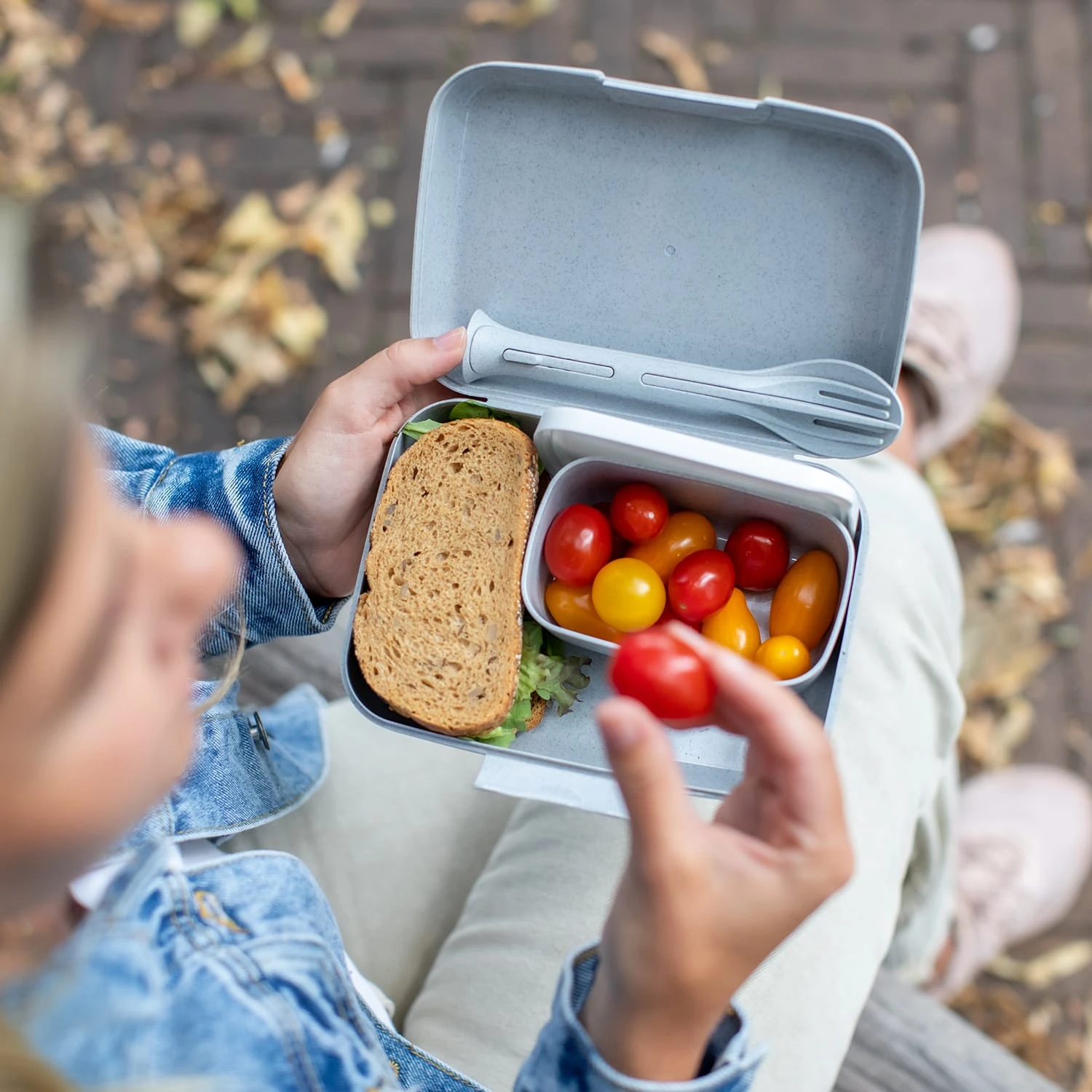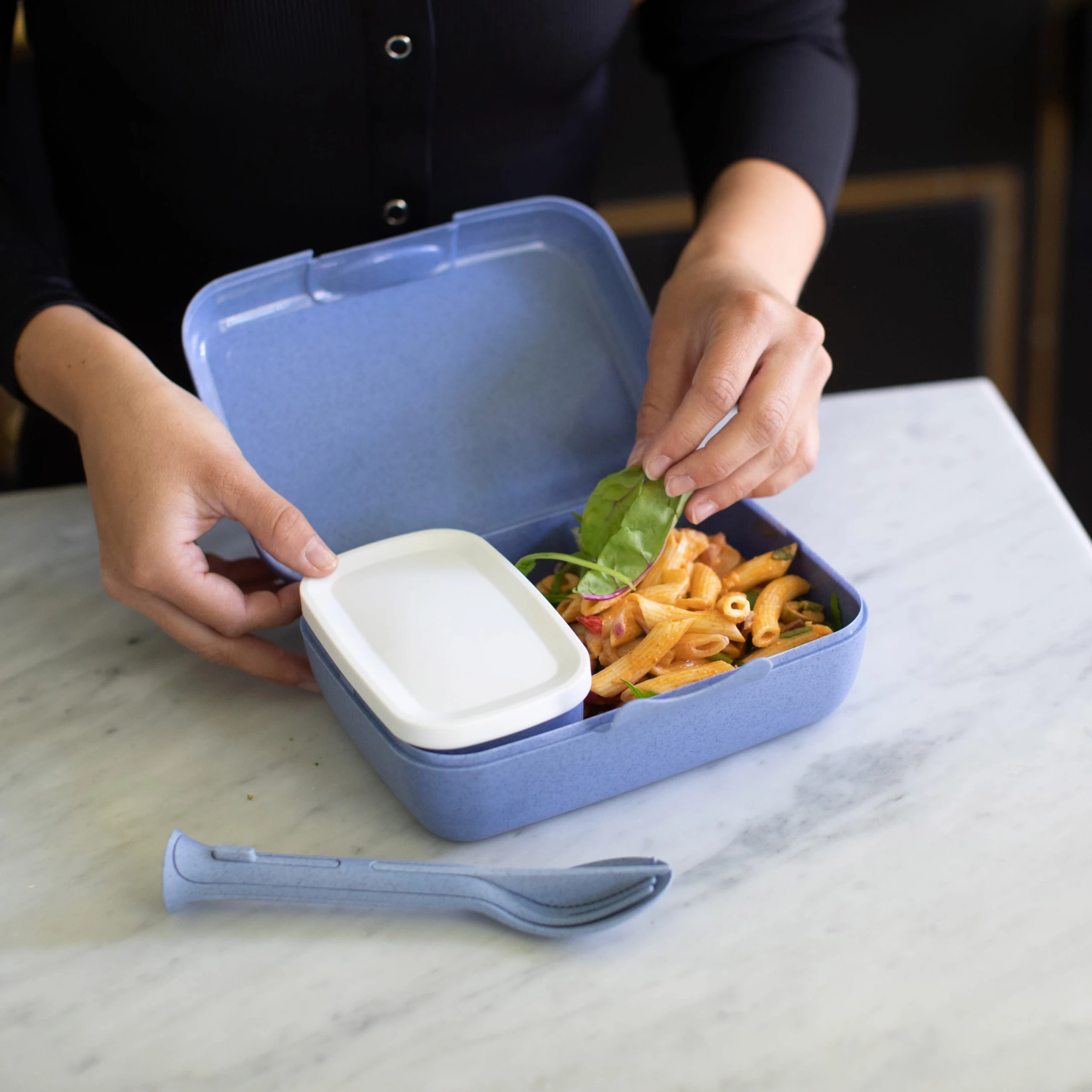 Lunchbox-Set CANDY READY hat alles, was man für ein gesundes Mittagessen unterwegs braucht. In der großen Box CANDY L und der auslaufsicheren Dose CANDY S sind Salate und Dressing, Gemüsesticks und Dip, Sandwiches und Obst sauber voneinander getrennt und das Essen bleibt appetitlich bis zum Verzehr. Besteckset KLIKK POCKET findet in der großen Box ebenfalls Platz und rundet das Lunchbox-Set perfekt ab. 3er-Set •3-teiliges Lunchbox-Set•inkl.Besteck•auslaufsichere Dose CANDY S•perfekt für die Mittagspause und unterwegs•umweltfreundlich•lebensmittelecht•100% CO2-neutral KOZIOL ORGANIC