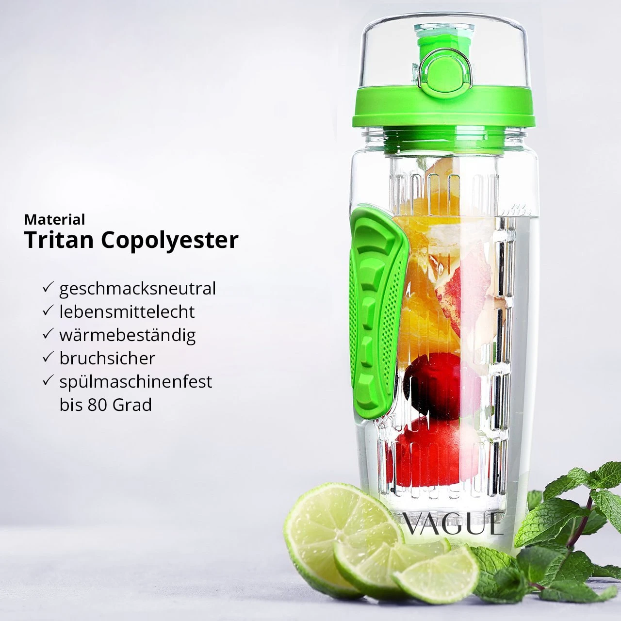 Durch Zugabe frischer Früchte oder Gemüse in das Früchtesieb der Flasche werden dem Körper wichtige Nährstoffe und Vitamine zugeführt
