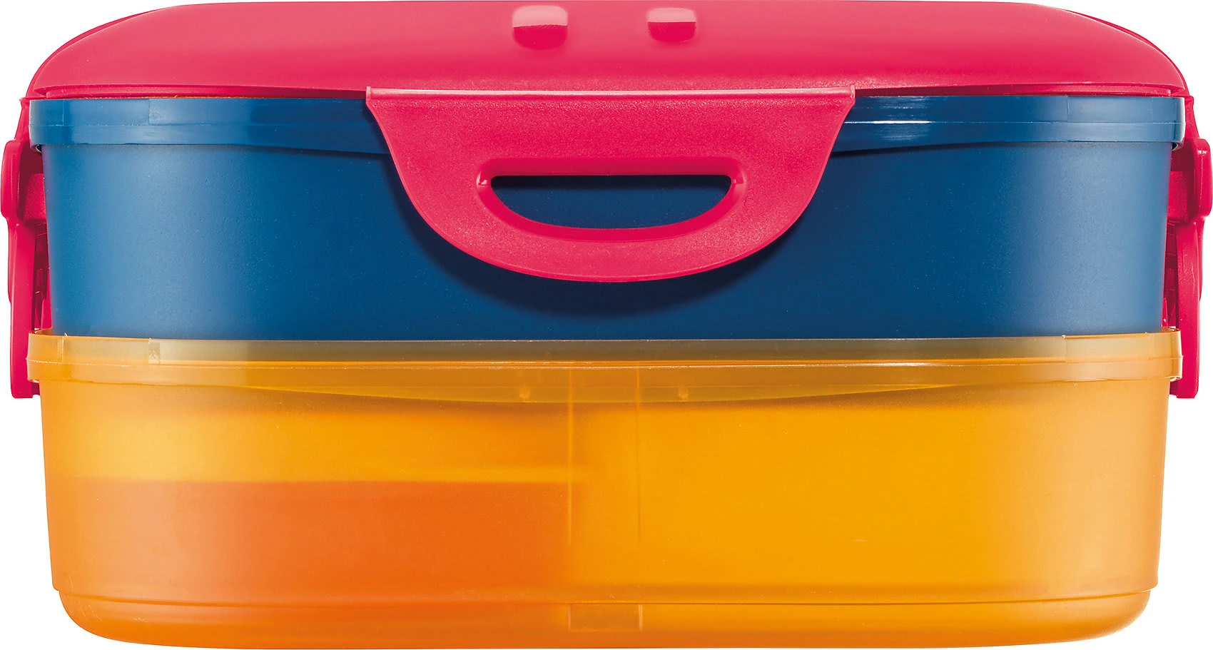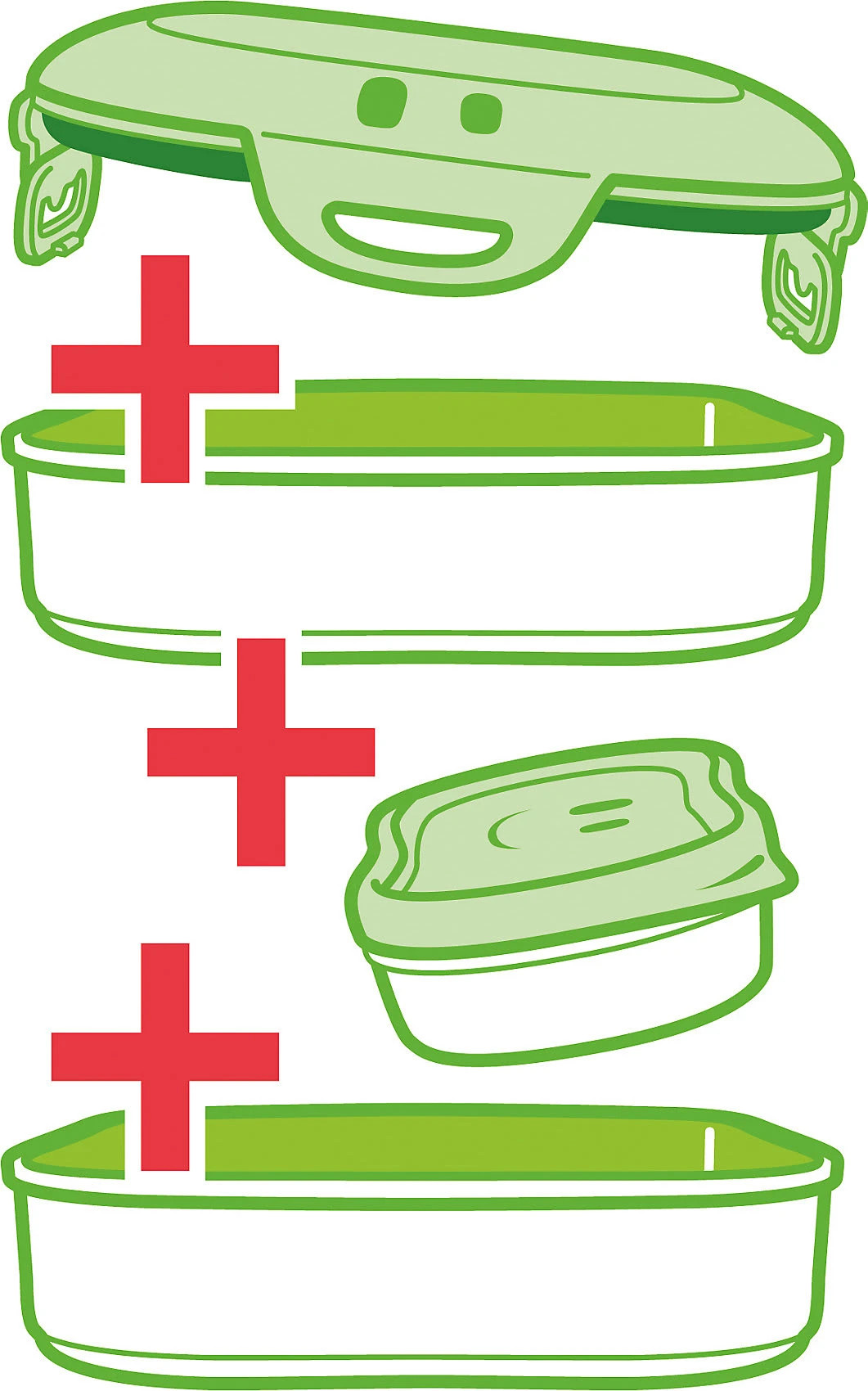 Diese Brotdose 3in1 verfügt über 3 getrennte Behältnisse, die auch als eine Boxkombination oder jeweils einzeln verwendet werden können. Das obere Fach ist dabei auslaufsicher und kann auch für Mahlzeiten mit Saucen oder für Eintöpfe verwendet werden. Das untere Fach ist für trockene Lebensmittel, wie z.B. Butterbrote, Obst, Gemüse, Müsli oder Kekse geeignet. Die separate Snack-Box hat außerdem ein Fassungsvermögen von 150 ml und kann z.B. für den Transport von Saucen oder Joghurt. Die Form ist speziell dafür entwickelt worden, dass die Snack-Box perfekt in die beiden größeren Behälter reinpasst.