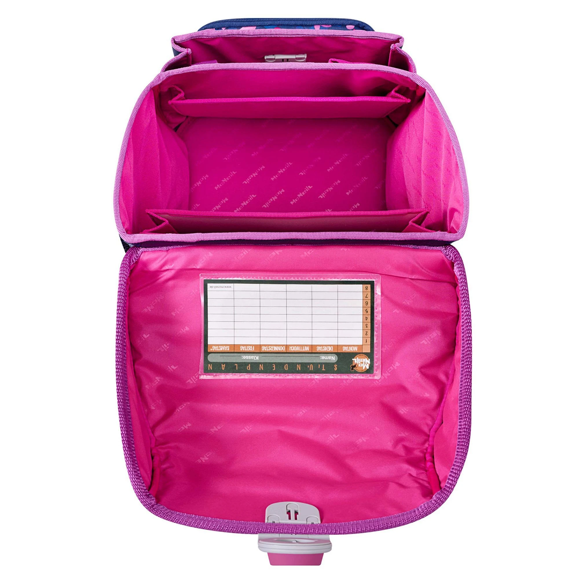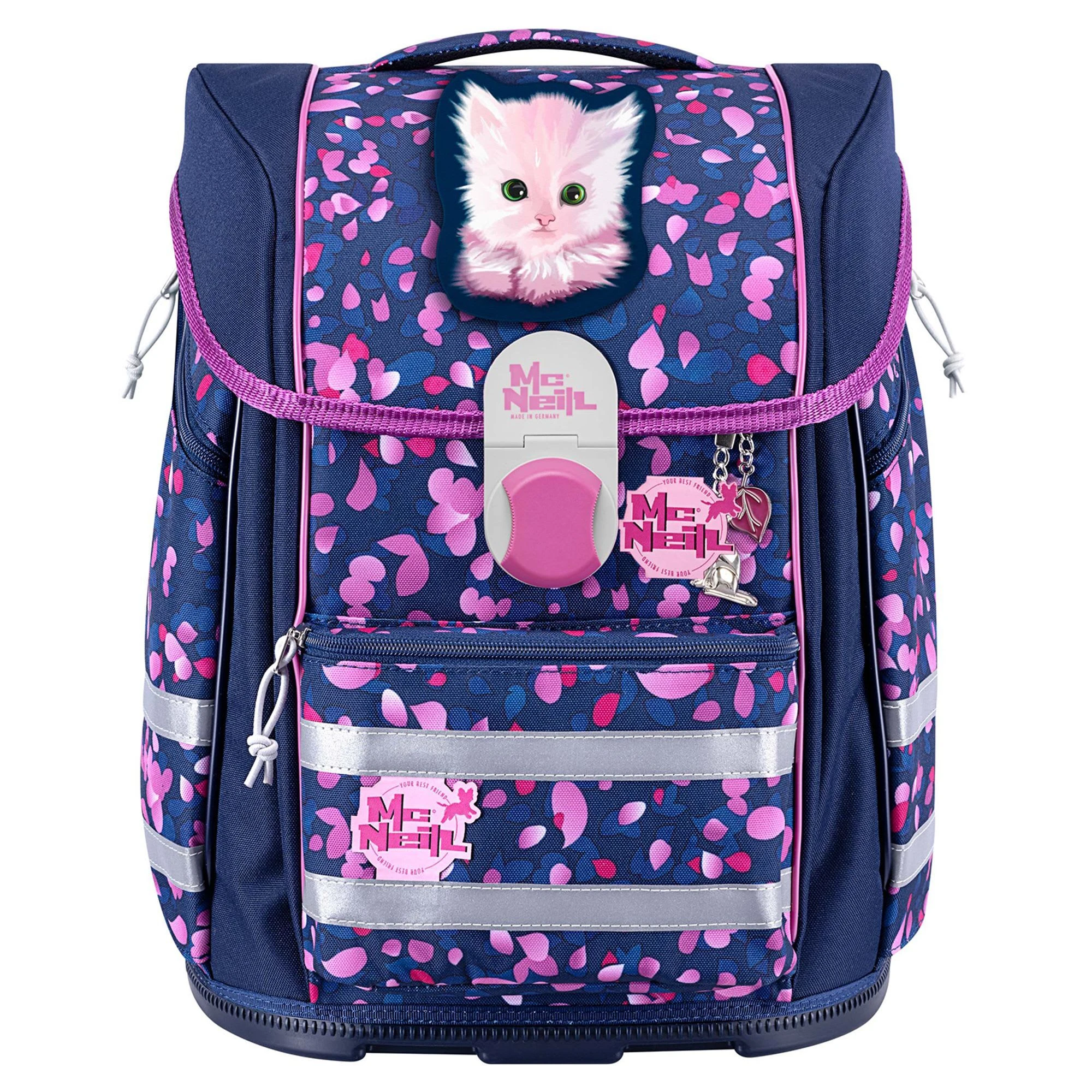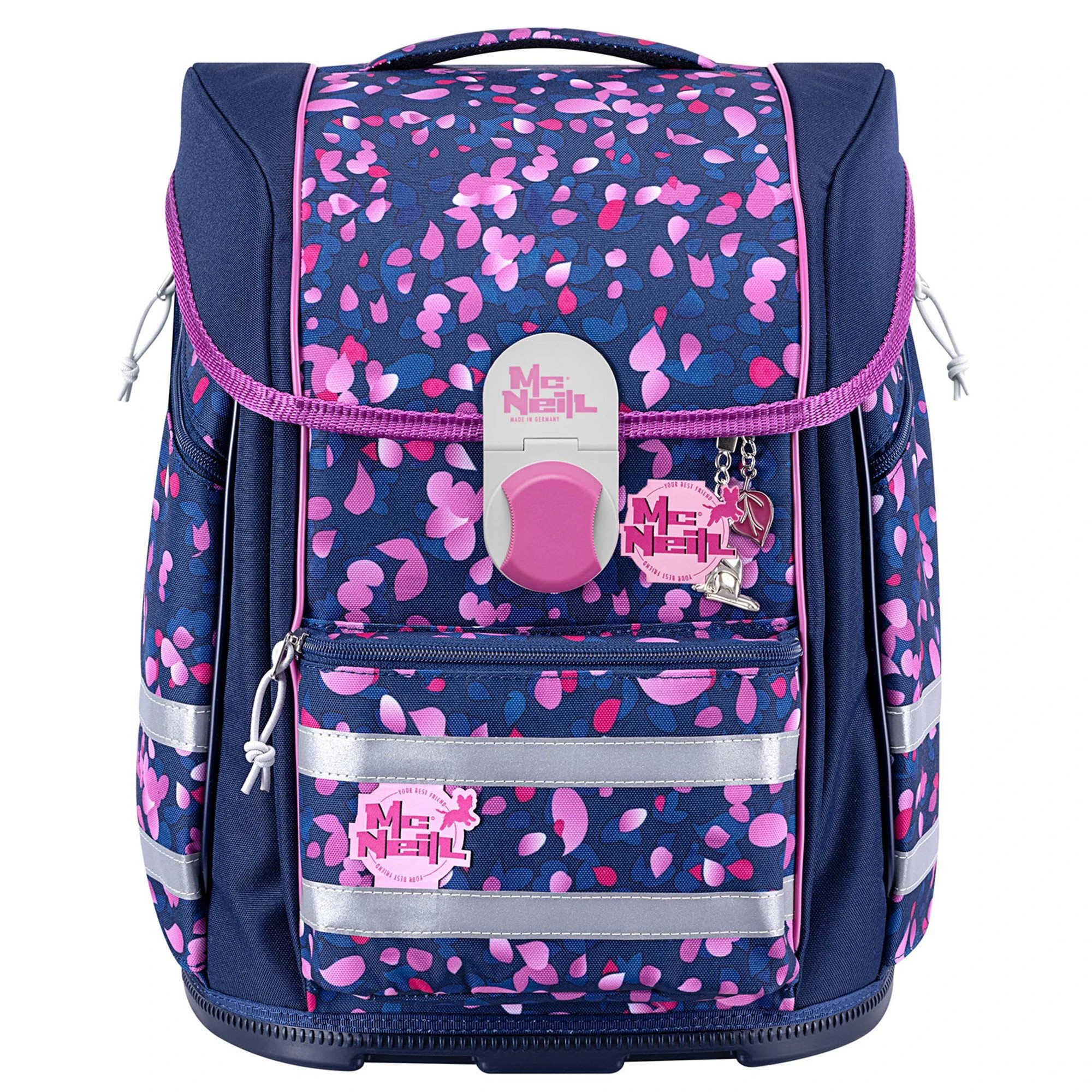 5-teiliges Schulranzen-Set von McNeill, bestehend aus Schulranzen, Sportschuhbeutel, Federmäppchen gefüllt, Schlamperrolle und McAddys Motivmagnet. Top-Tragekomfort durch SmartFlex System, das mitwächst, atmungsaktive Rückenpolsterung, höhenverstellbare Gurte owie Becken- und Brustgurt, Einhandmagnetschloss, der sehr leichtgängig wie von selbst schließt. Die Bodenplatte ist aus Plastik und bietet dadurch einen wasserfesten und sicheren Stand. Geräumiges Hauptfach, große Vortasche und Seitentaschen, die für die Trinkflasche oder sonstige Mitbringsel für die Schule verwendet werden können. Schulranzen Außenmaß: 30 cm x 26 cm x 38 cm / Leergewicht: ca. 1.200 g / Volumen: ca. 22 l