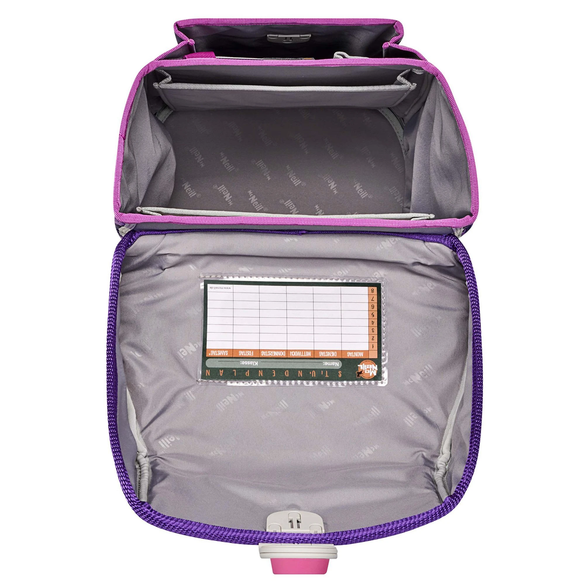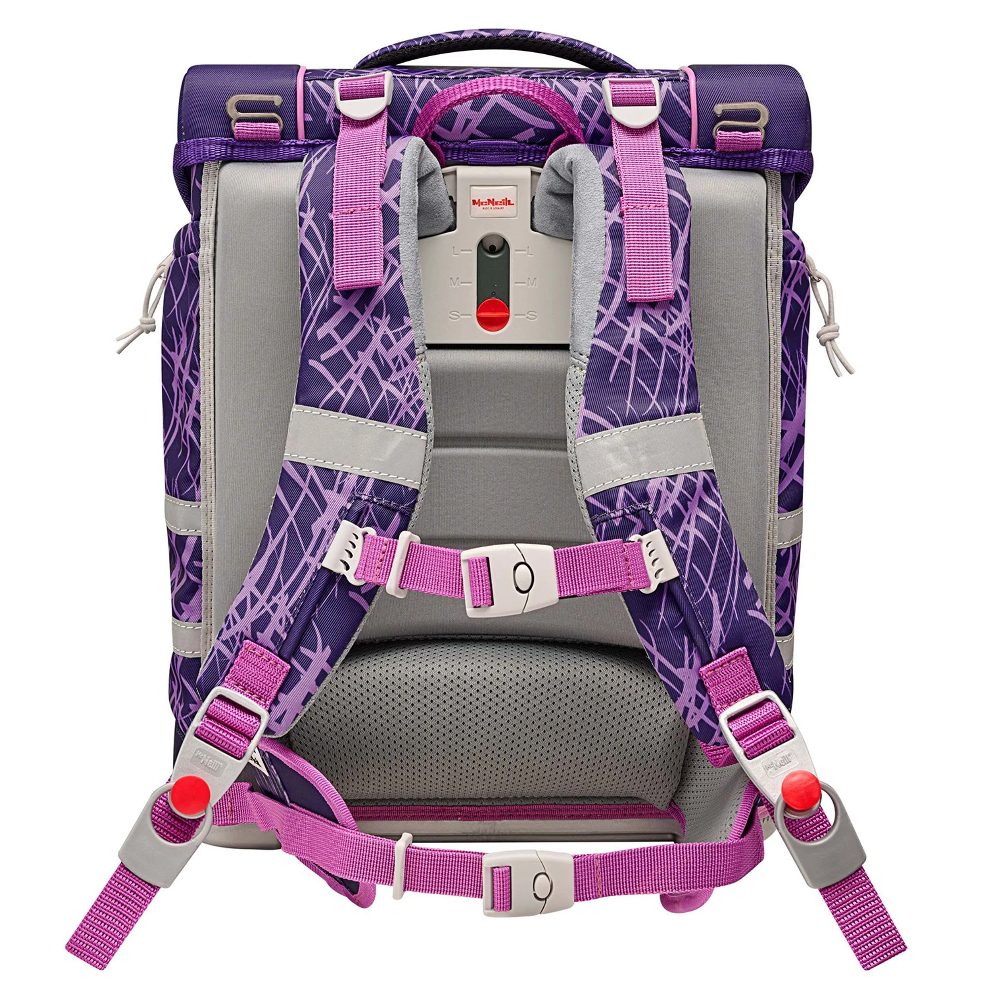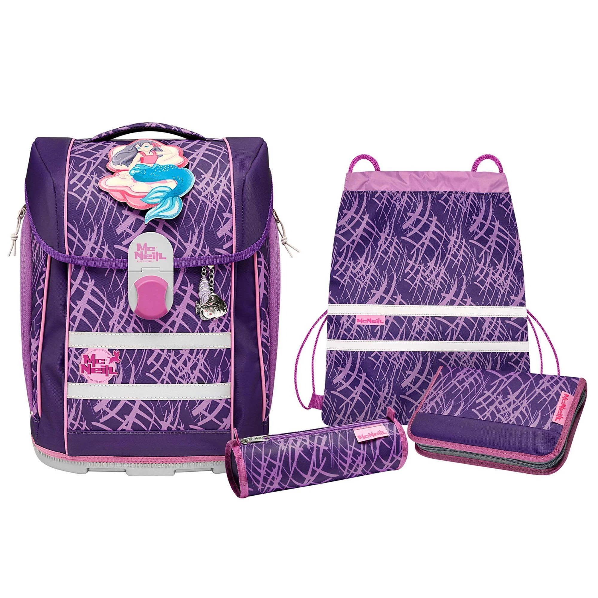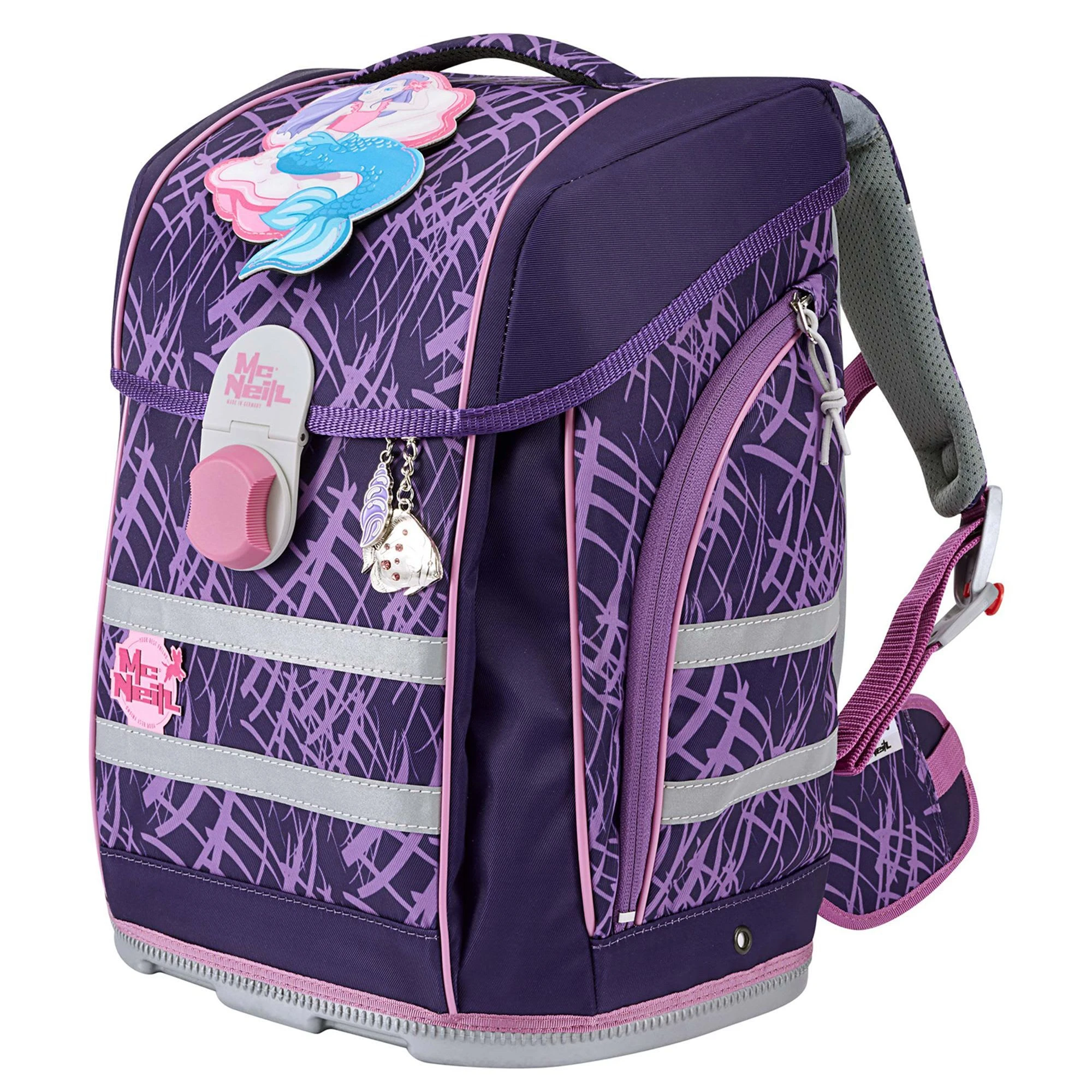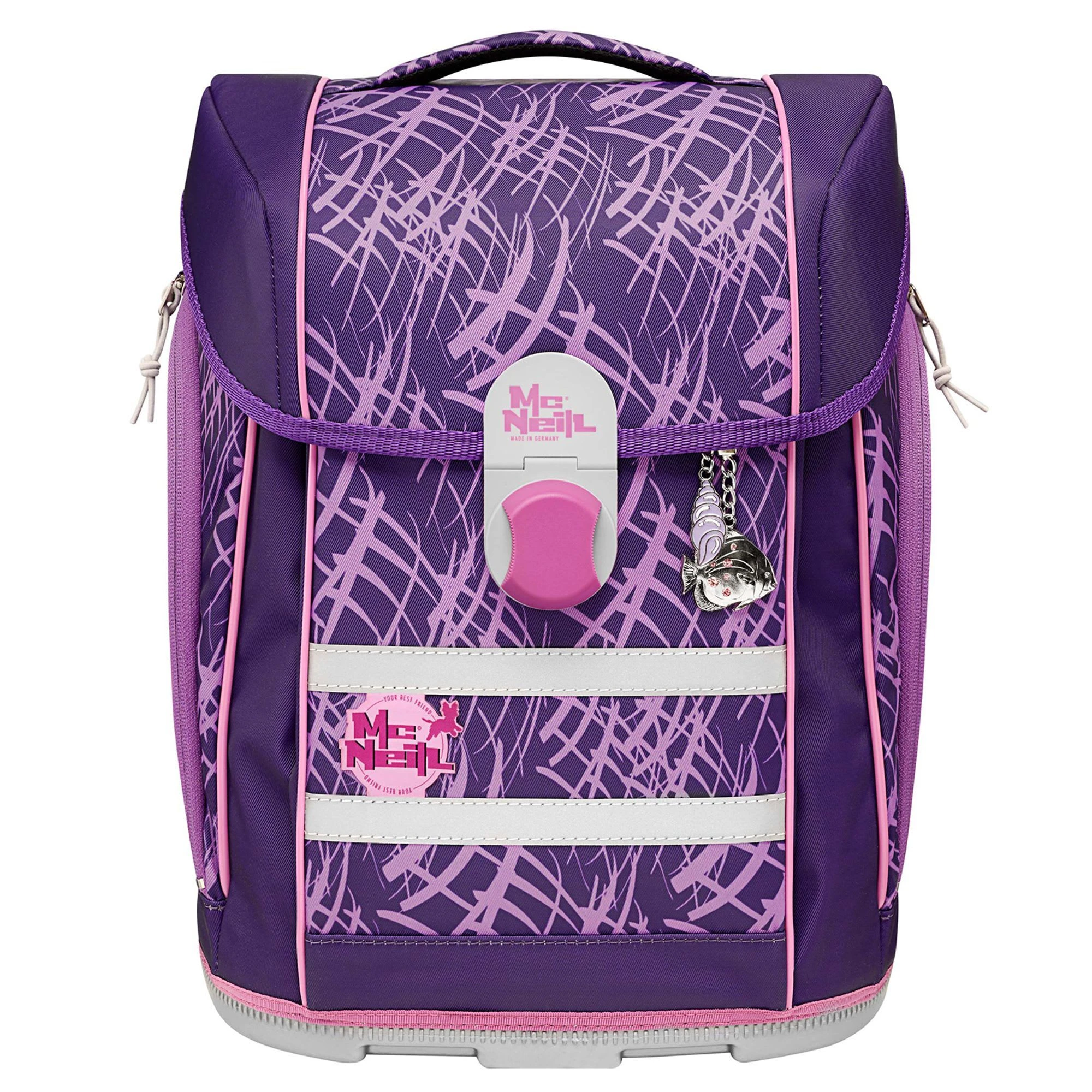 6-teiliges Schulranzen-Set von McNeill, bestehend aus Schulranzen, Sportschuhbeutel, Federmäppchen gefüllt, Schlamperrolle, Motivmagnet und an- und ausschaltbarem Leuchtanhänger. Top-Tragekomfort durch die atmungsaktive Rückenpolsterung, höhenverstellbare Gurte sowie Becken- und Brustgurt. Der Ranzen hat einen Schnappverschluss, der magnetisch angezogen wird und sehr leichtgängig wie von selbst schließt. Die Bodenplatte ist aus Plastik und bietet dadurch einen wasserfesten und sicheren Stand. Geräumige offene Seitentaschen können für die Trinkflasche oder sonstige Mitbringsel für die Schule verwendet werden. An- und ausschaltbarer Leuchtanhänger bietet eine sichere und optimale Lösung, wenn es um die Sichtbarkeit ihres Kindes geht. Schulranzen Außenmaß: 30 cm x 22 cm x 38 cm / Leergewicht: ca. 1.000 g / Volumen: ca. 20 l