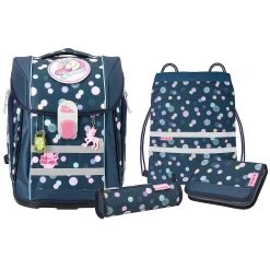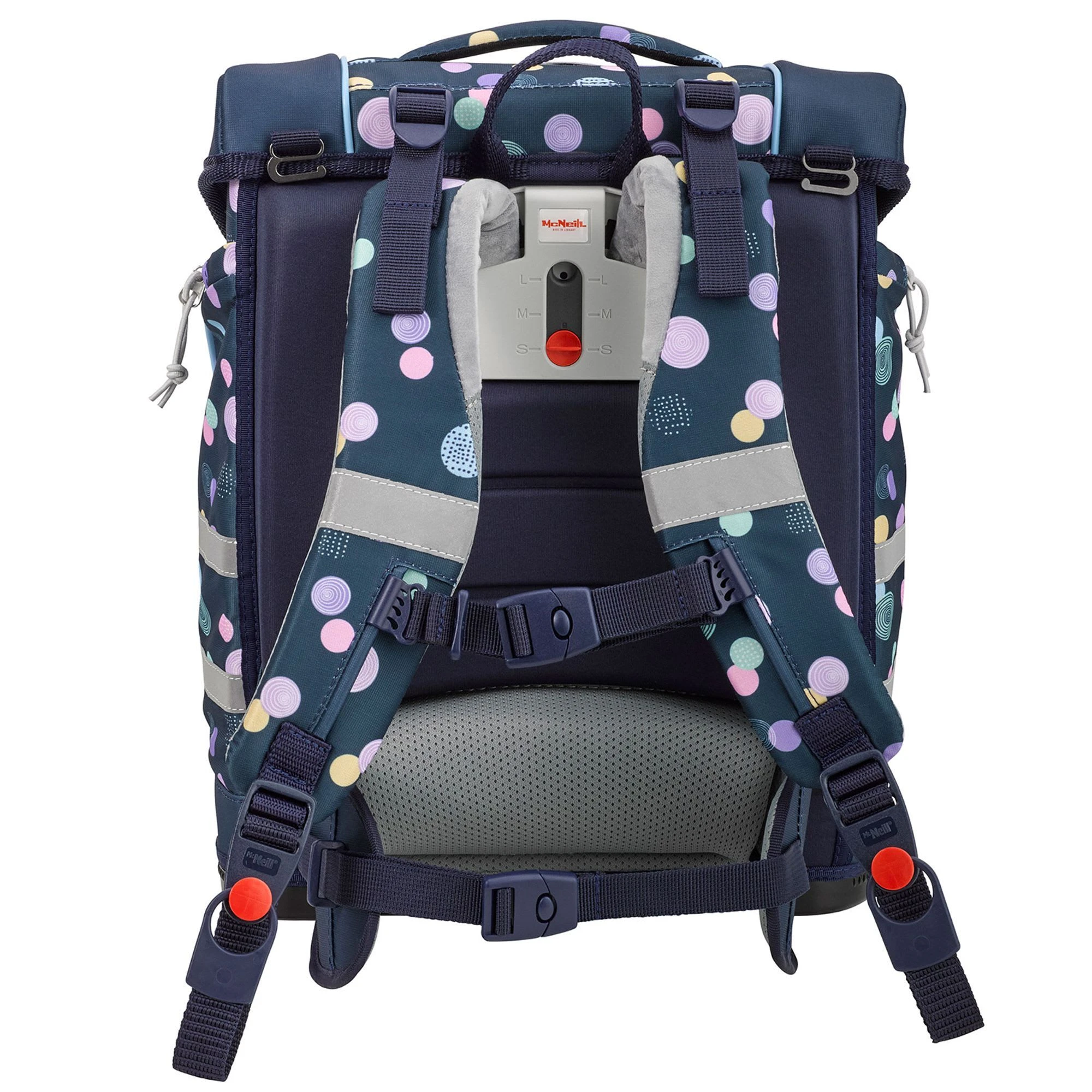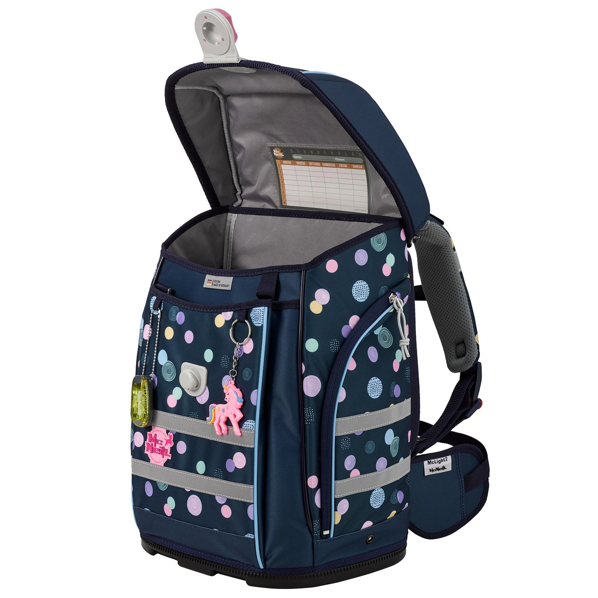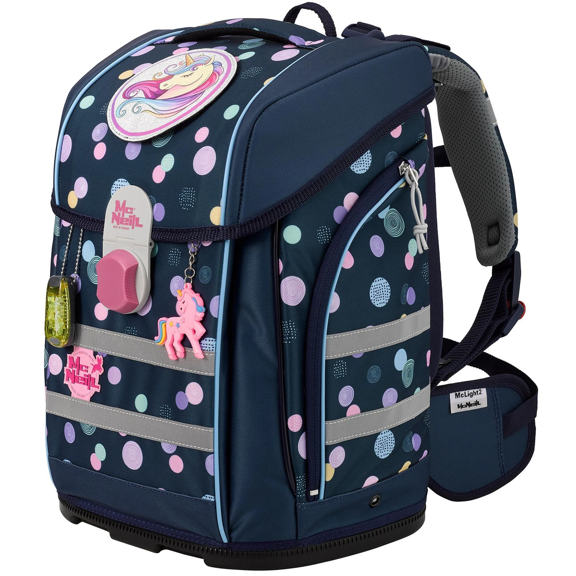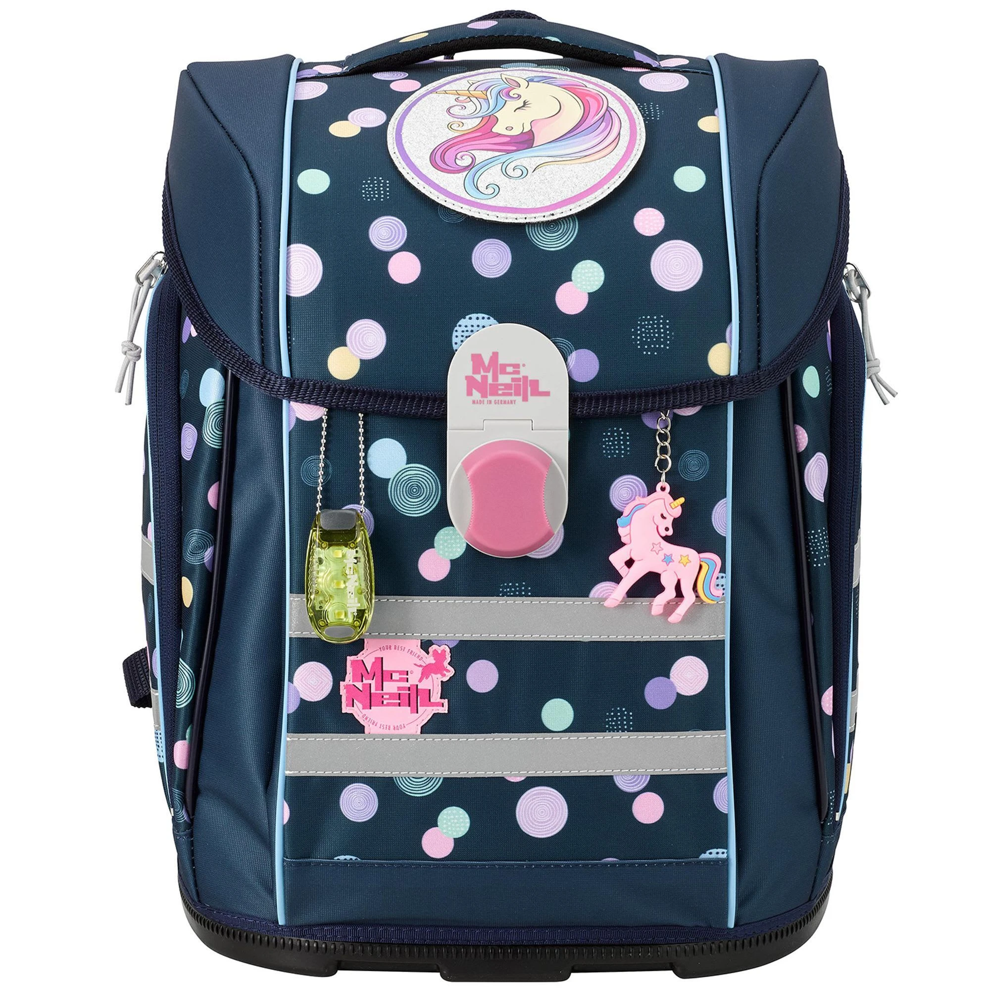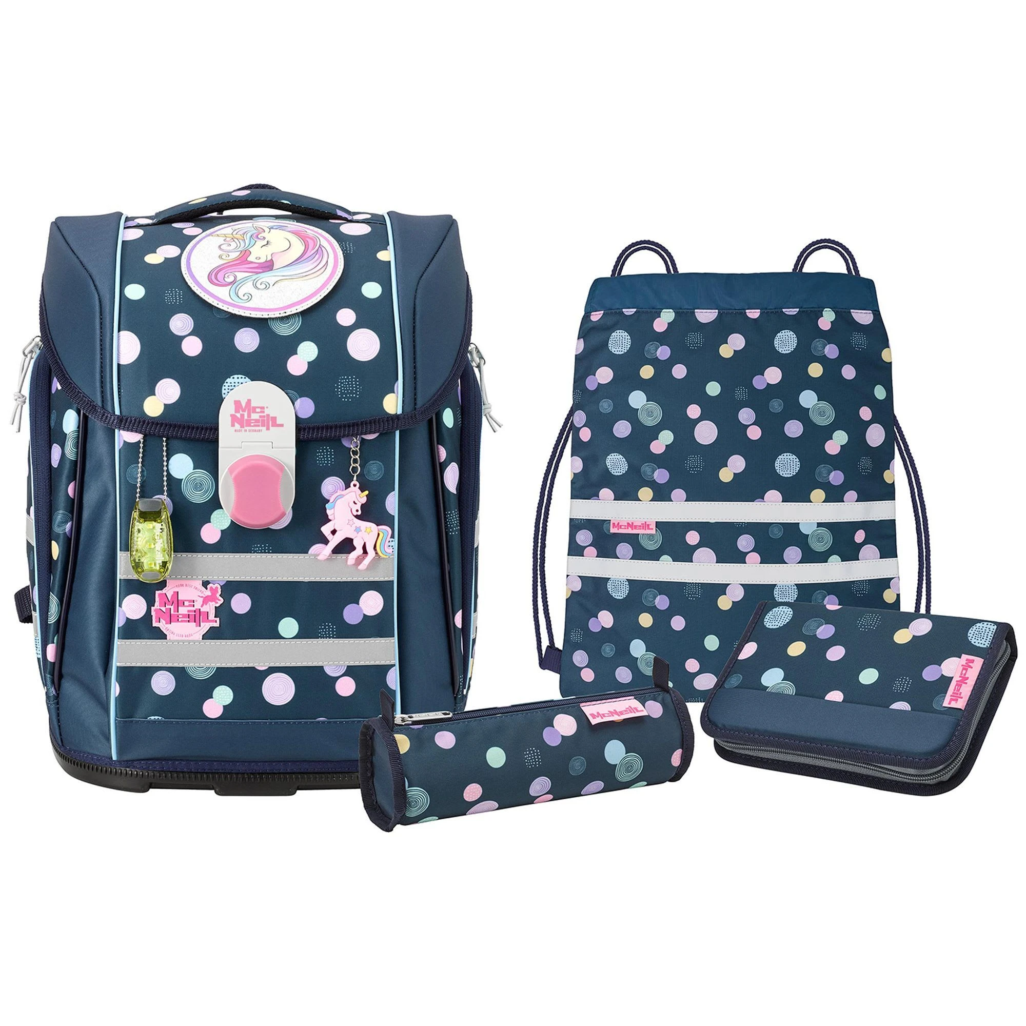 6-teiliges Schulranzen-Set von McNeill, bestehend aus Schulranzen, Sportschuhbeutel, Federmäppchen gefüllt, Schlamperrolle, Motivmagnet und an- und ausschaltbarem Leuchtanhänger. Top-Tragekomfort durch die atmungsaktive Rückenpolsterung, höhenverstellbare Gurte sowie Becken- und Brustgurt. Der Ranzen hat einen Schnappverschluss, der magnetisch angezogen wird und sehr leichtgängig wie von selbst schließt. Die Bodenplatte ist aus Plastik und bietet dadurch einen wasserfesten und sicheren Stand. Geräumige offene Seitentaschen können für die Trinkflasche oder sonstige Mitbringsel für die Schule verwendet werden. An- und ausschaltbarer Leuchtanhänger bietet eine sichere und optimale Lösung, wenn es um die Sichtbarkeit ihres Kindes geht. Schulranzen Außenmaß: 30 cm x 22 cm x 38 cm / Leergewicht: ca. 1.000 g / Volumen: ca. 20 l