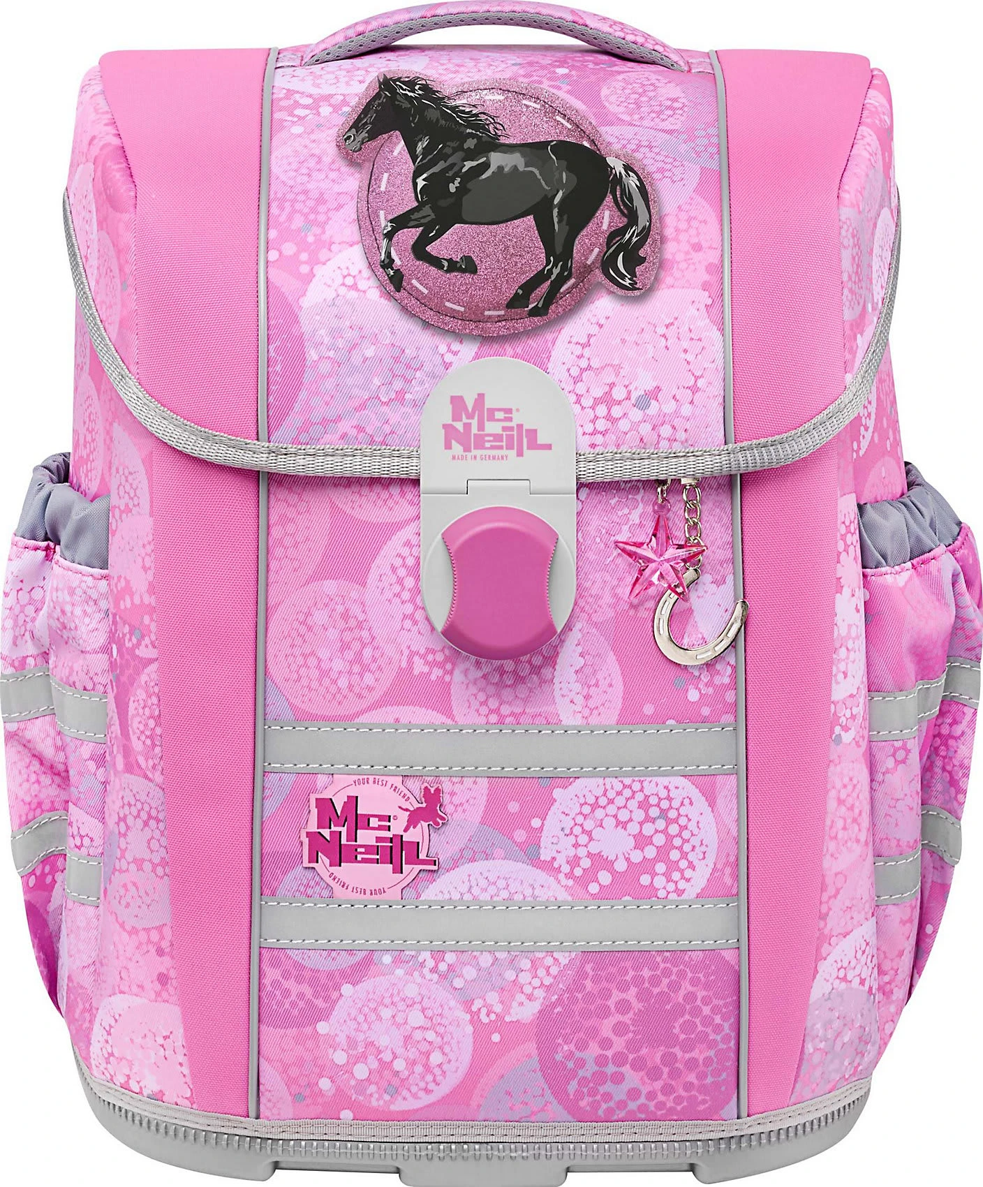 Das Schulranzenset mac2 von McNeill enthält neben dem Ranzen auch einen passenden Turnbeutel, ein komplett bestücktes Federmäppchen und ein Schlampermäppchen. Reflektoren am Ranzen erhöhen die Sichtbarkeit im Straßenverkehr und bei schlechten Sichtverhältnissen. Der Ranzen ist ein echtes Leichtgewicht und mit dem Smart-Flex Tragesystem ausgestattet. Das System ermöglicht eine Höhenverstellung der Schultergurte und eine optimale Anpassung an die Größe des Kindes. Auch die verstellbaren Schulter- und Brustgurte sowie der gepolsterte Rücken tragen zu einer angenehmen Gewichtsverteilung und möglichst hohem Komfort bei.