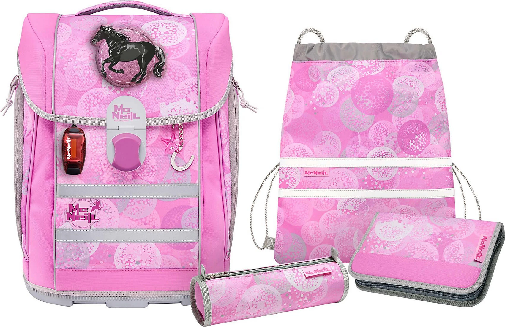 Das sechsteilige Schulranzenset “McLight 2” aus dem Hause McNeill ist in vielen verschiedenen Variationen erhältlich, sodass jedes Schulkind genau den richtigen Ranzen mit passendem Zubehör findet. Das Set besteht aus einem Ranzen, einem Sportschuhbeutel, einem befüllten Etui sowie einer Schlamperrolle und bietet damit alles, was es für einen guten Start in den Schulalltag braucht.