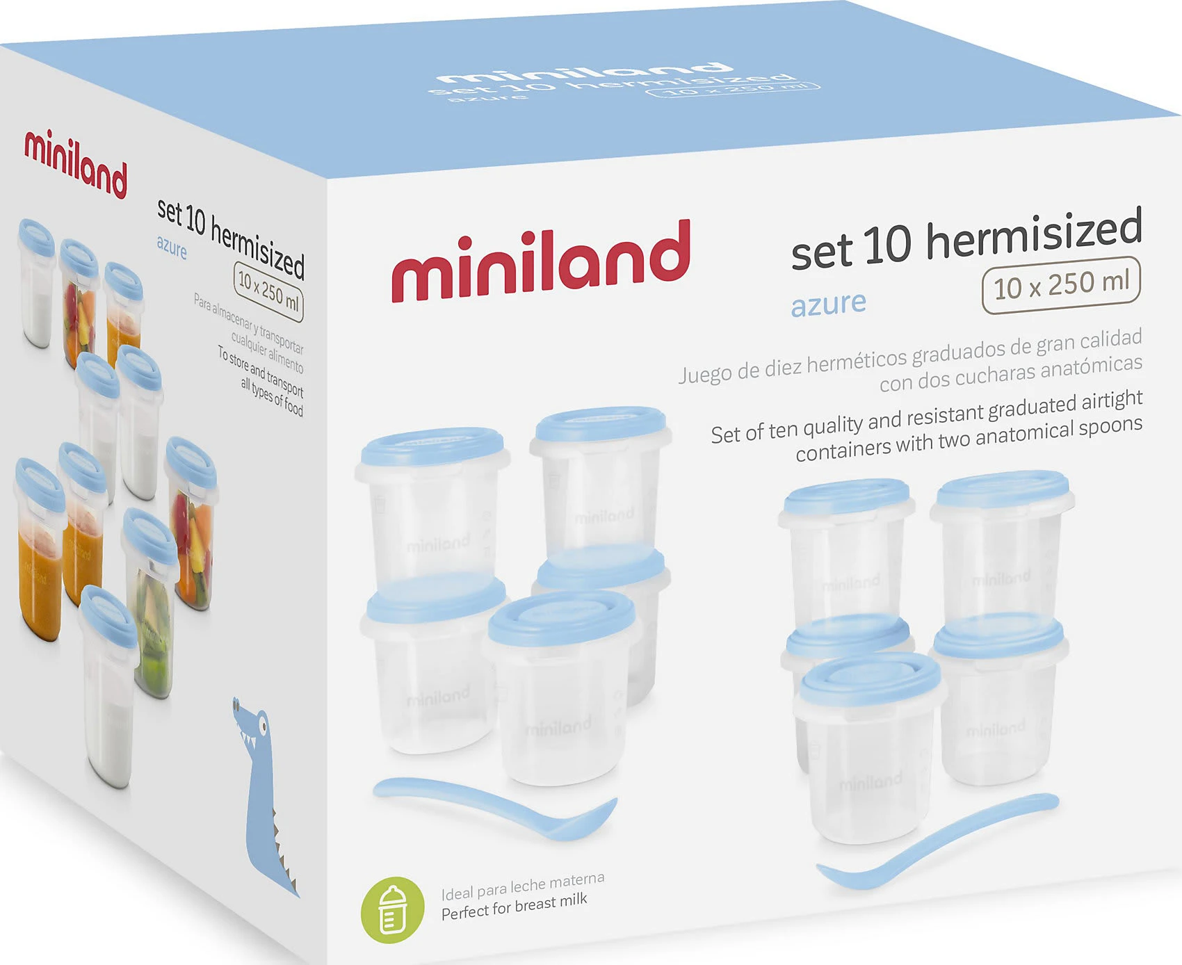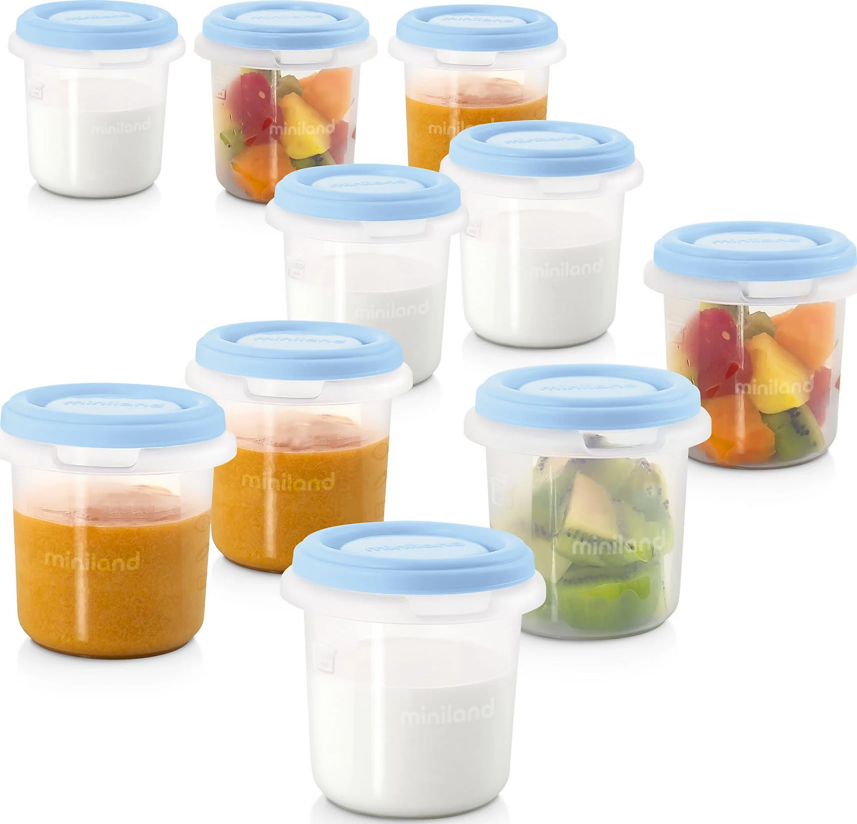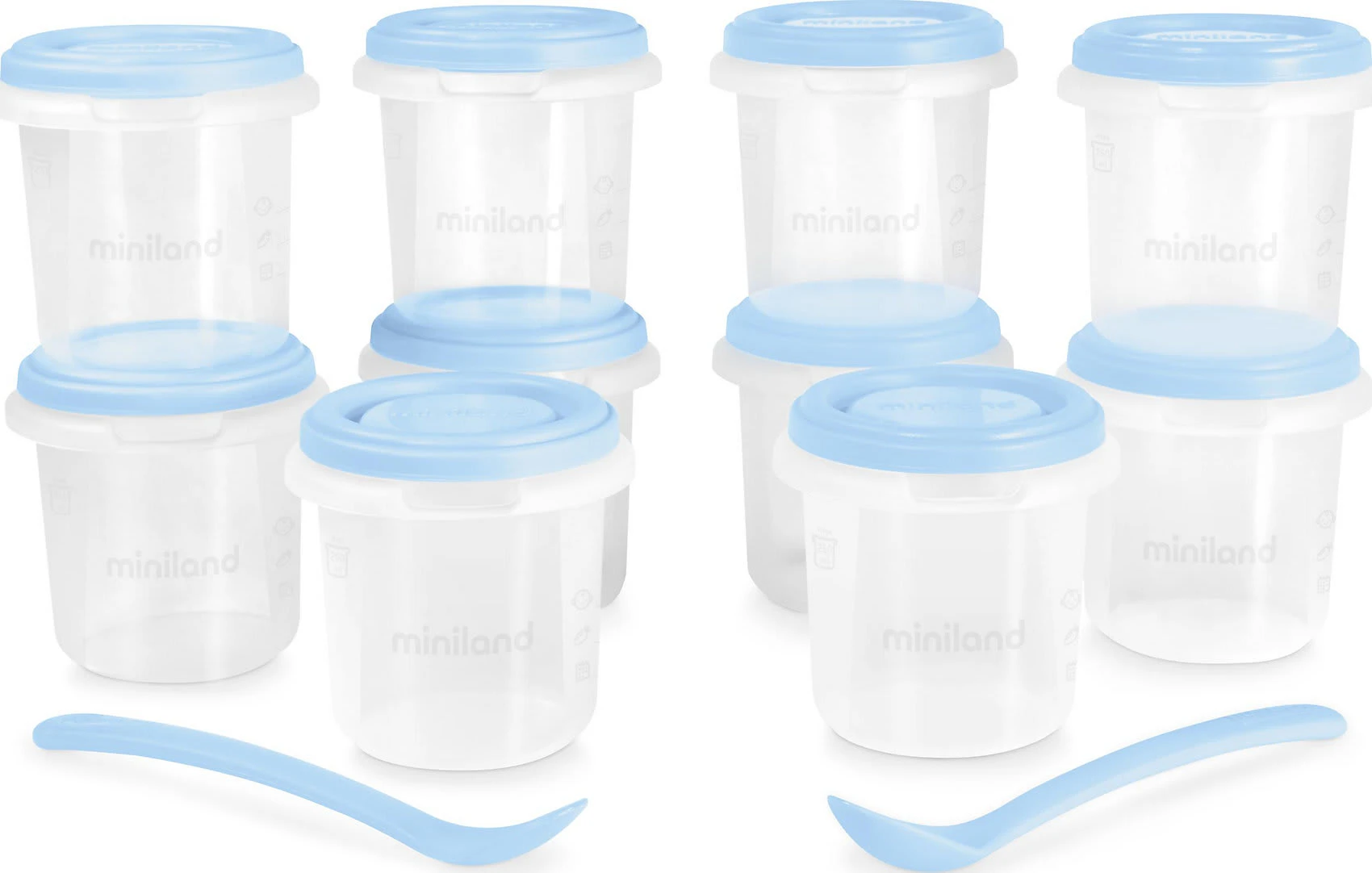 Mit diesem praktischen Aufbewahrungsbehälter-Set der Marke Miniland hat man Mahlzeiten und Snacks für seinen kleinen Liebling immer und überall dabei! Die zehn praktischen Becher eignen sich klasse für Säfte, Muttermilch, Obst und vieles mehr. Soll der Inhalt erwärmt werden, kann der Becher auch in der Mikrowelle verwendet werden. Auch zwei praktische Löffelchen sind hier mit dabei!