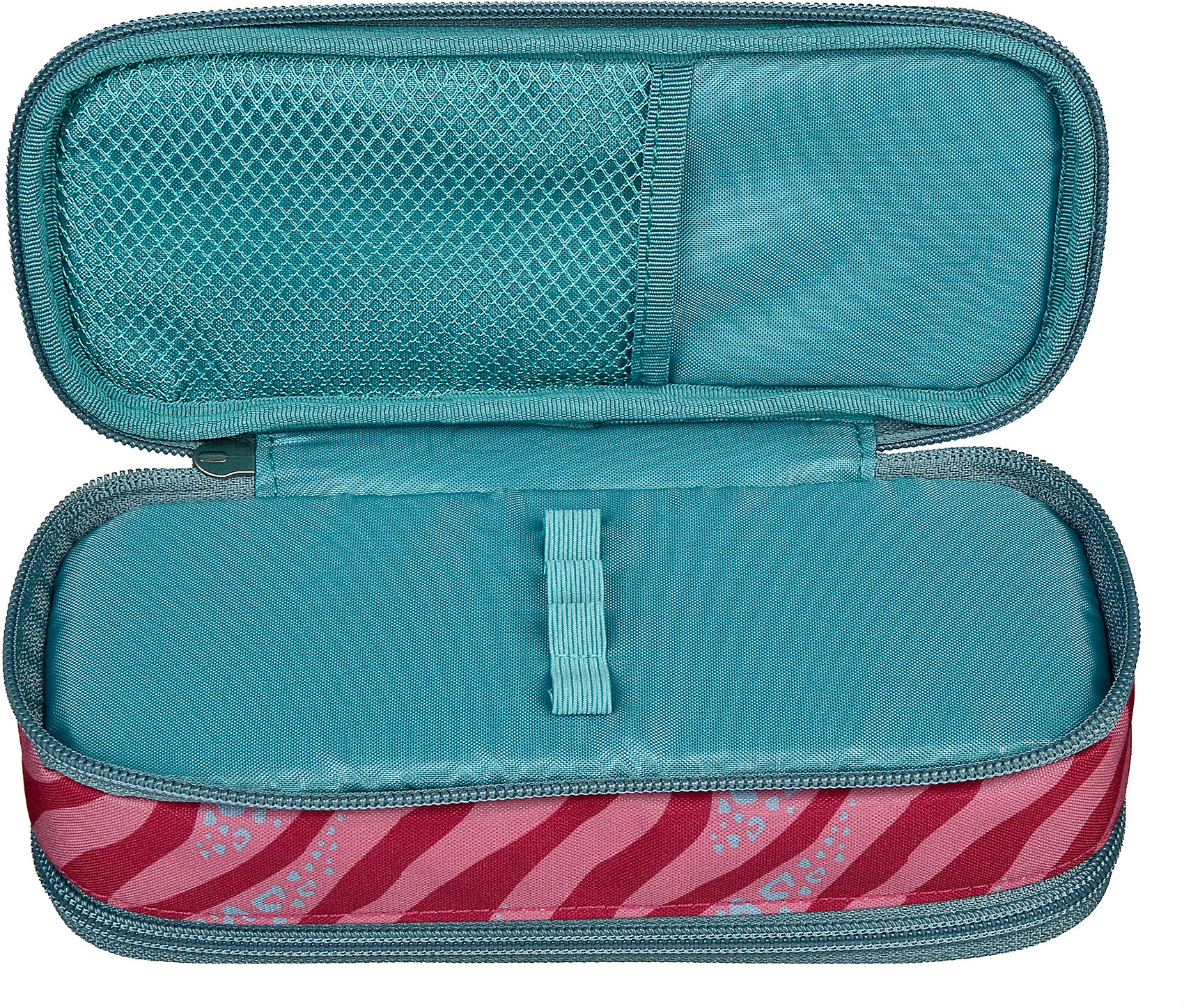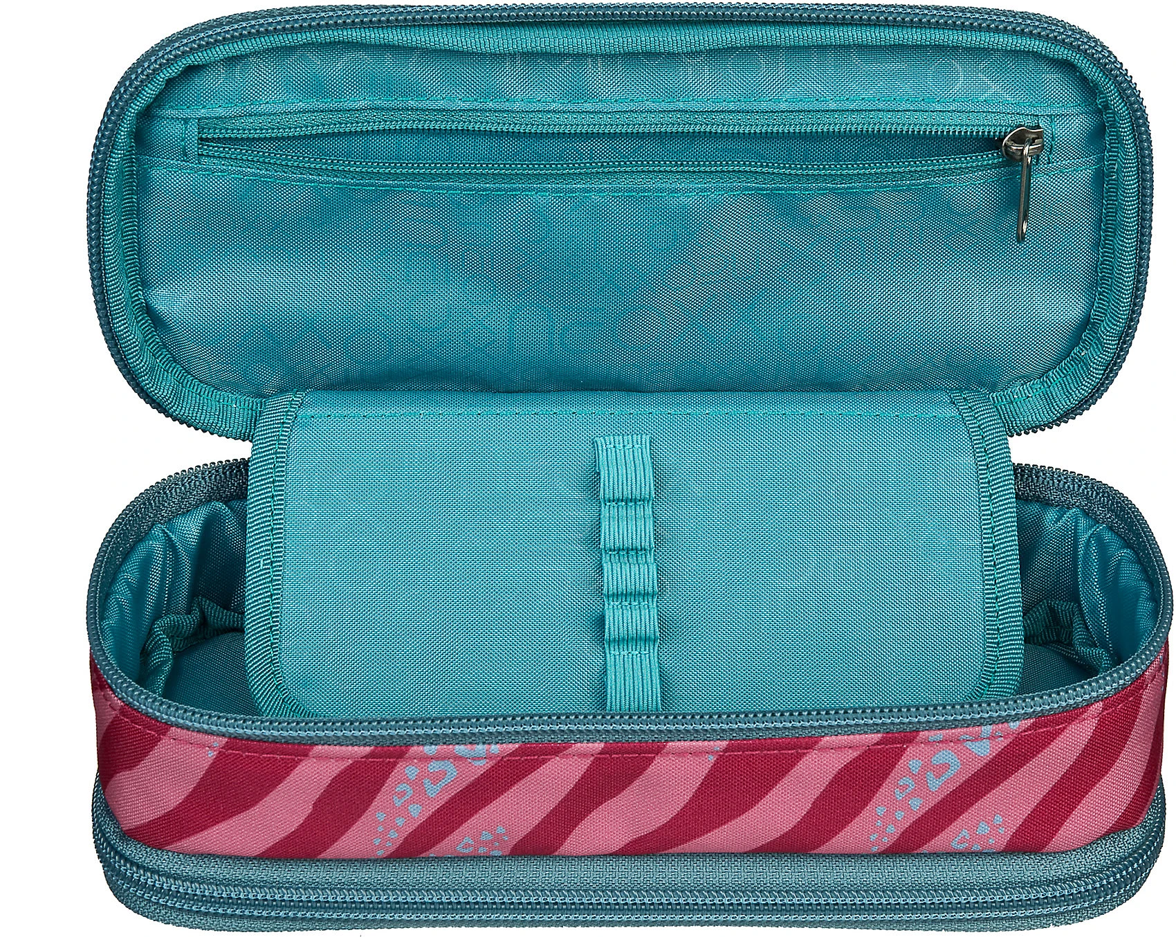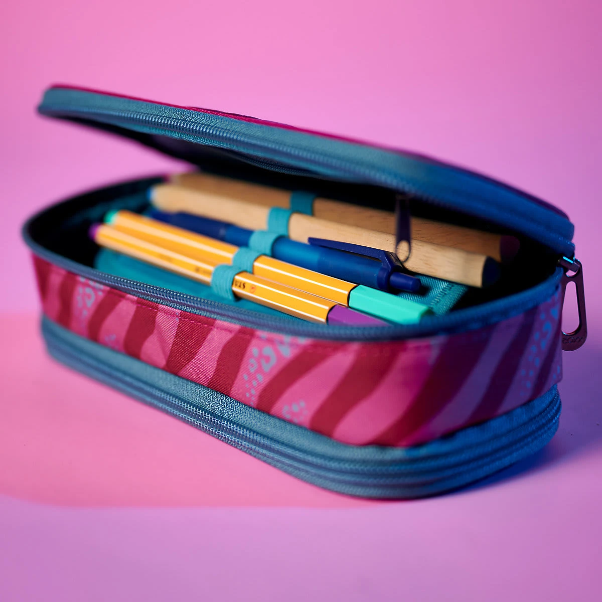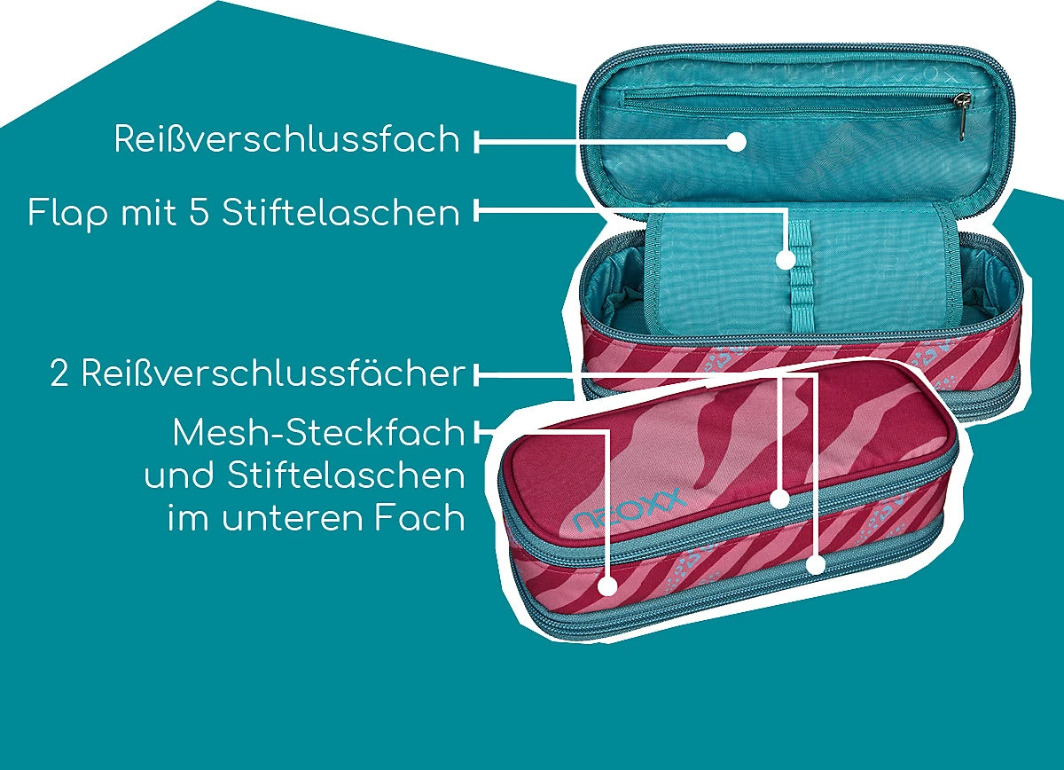 Oberes Fach: Viel Platz für Stifte, Kleber, Radiergummi, eben alles für den Schulalltag. Mit dem Flap mit 5 Stiftelaschen sind die Lieblingsstifte schnell zur Hand. In das Reißverschlussfach des Schlamperetuis passen Notizen, Kleingeld oder ähnliches.