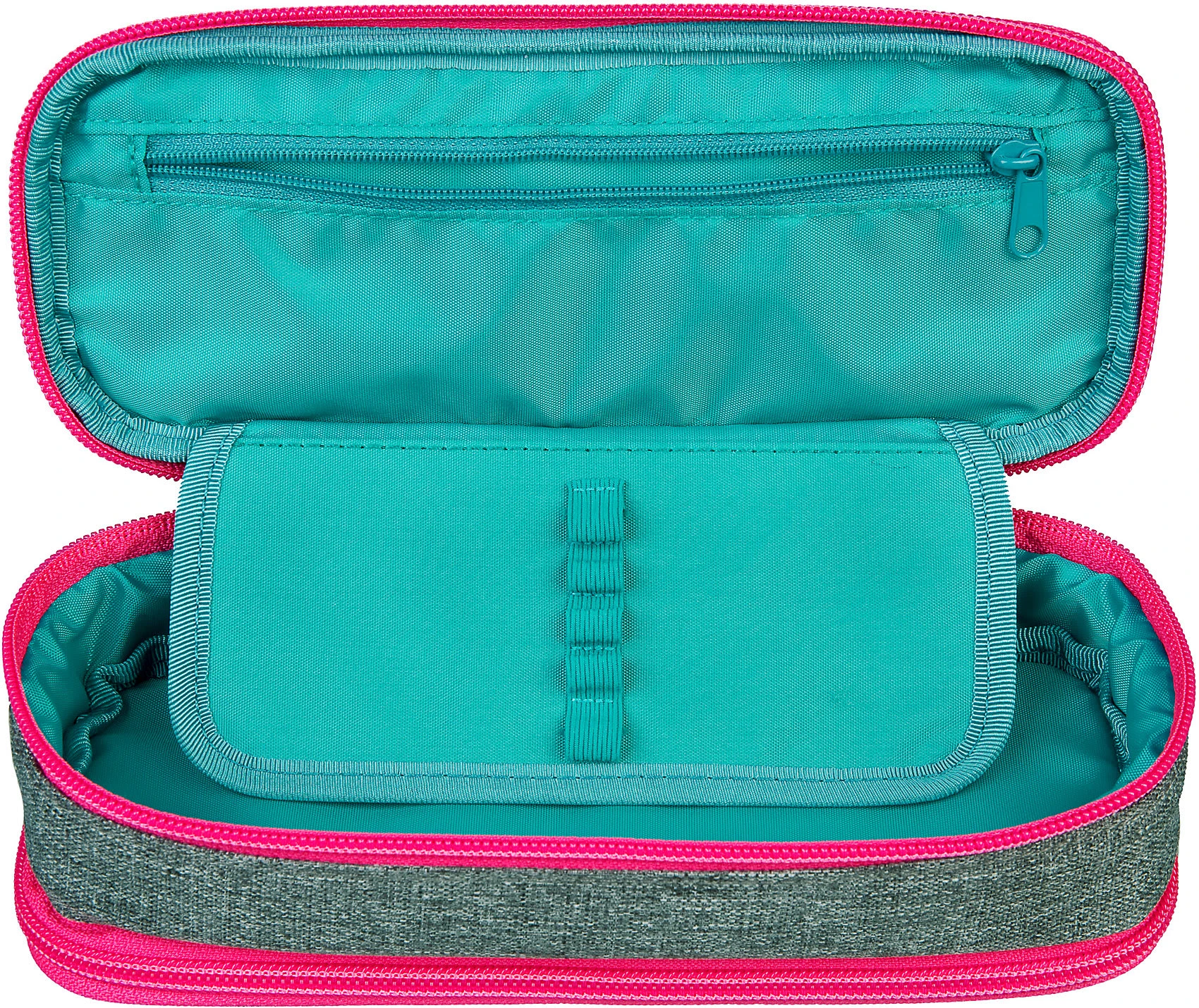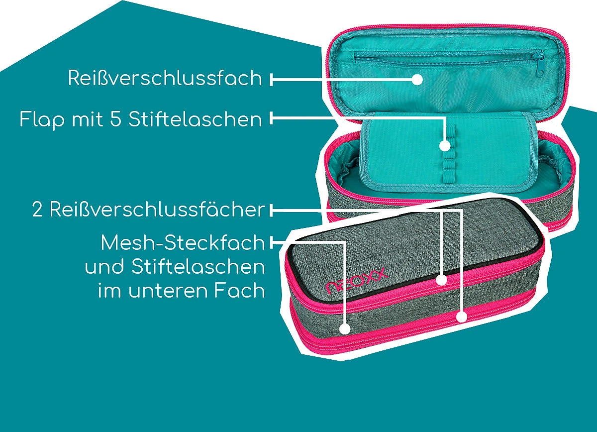 Oberes Fach: Viel Platz für Stifte, Kleber, Radiergummi, eben alles für den Schulalltag. Mit dem Flap mit 5 Stiftelaschen sind die Lieblingsstifte schnell zur Hand. In das Reißverschlussfach des Schlamperetuis passen Notizen, Kleingeld oder ähnliches.