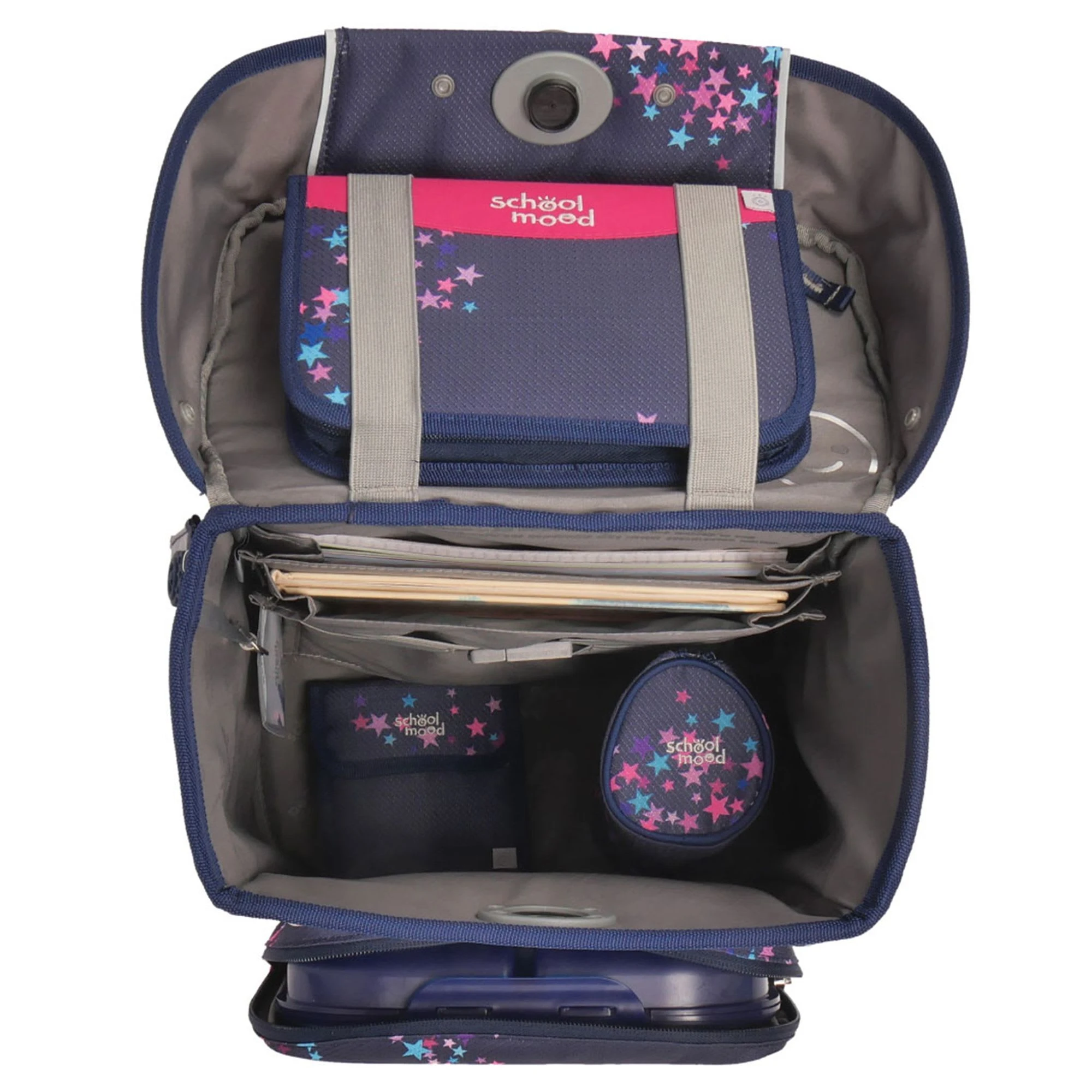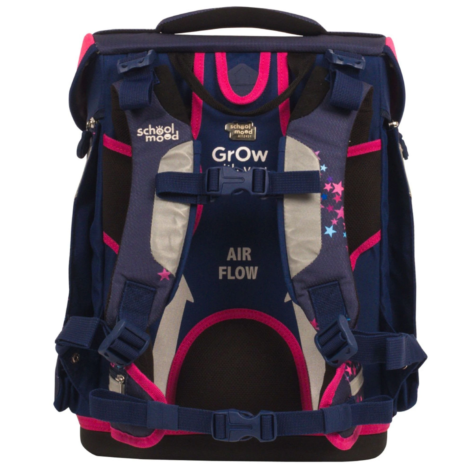 7-teiliges Schulranzen-Set von School-Mood, bestehend aus Schulranzen, Sportbeutel/Turnbeutel, Schüleretui (21-tlg.), Schlamperrolle, Brustbeutel, Brotdose und 3 Patchies. Klassischer Schulranzen der Hero Maxx Air+ Serie ist robust, wasserabwesend, leicht zu reinigen und lässt keine Wunsche offen. Selbstschließender Magnetverschluss ermöglicht ein kinderleichtes Öffnen und Schließen des Deckels. Das mitwachsende, ergonomisch geformte Tragesystem mit Brust- und Beckengurt bietet hervorragenden Tragekomfort und optimalen Sitz. Im Inneren ist der Schulranzen bestens ausgestattet und bietet Ordnung, Übersicht und viel Stauraum für Hefte, Bücher, Federmäppchen, Brotdose usw. Reflektierende Elemente sorgen für Sicherheit bei Dunkelheit. Mit wechselbaren Patchies für Motivaustausch lässt sich der Schulranzen immer neu und individuell gestalten. Dank integrierter Halterung kann der Sportbeutel am Schulranzen befestigt werden. Etui ist komplett bestückt (21tlg.) und verfügt über einen Stundenplan.