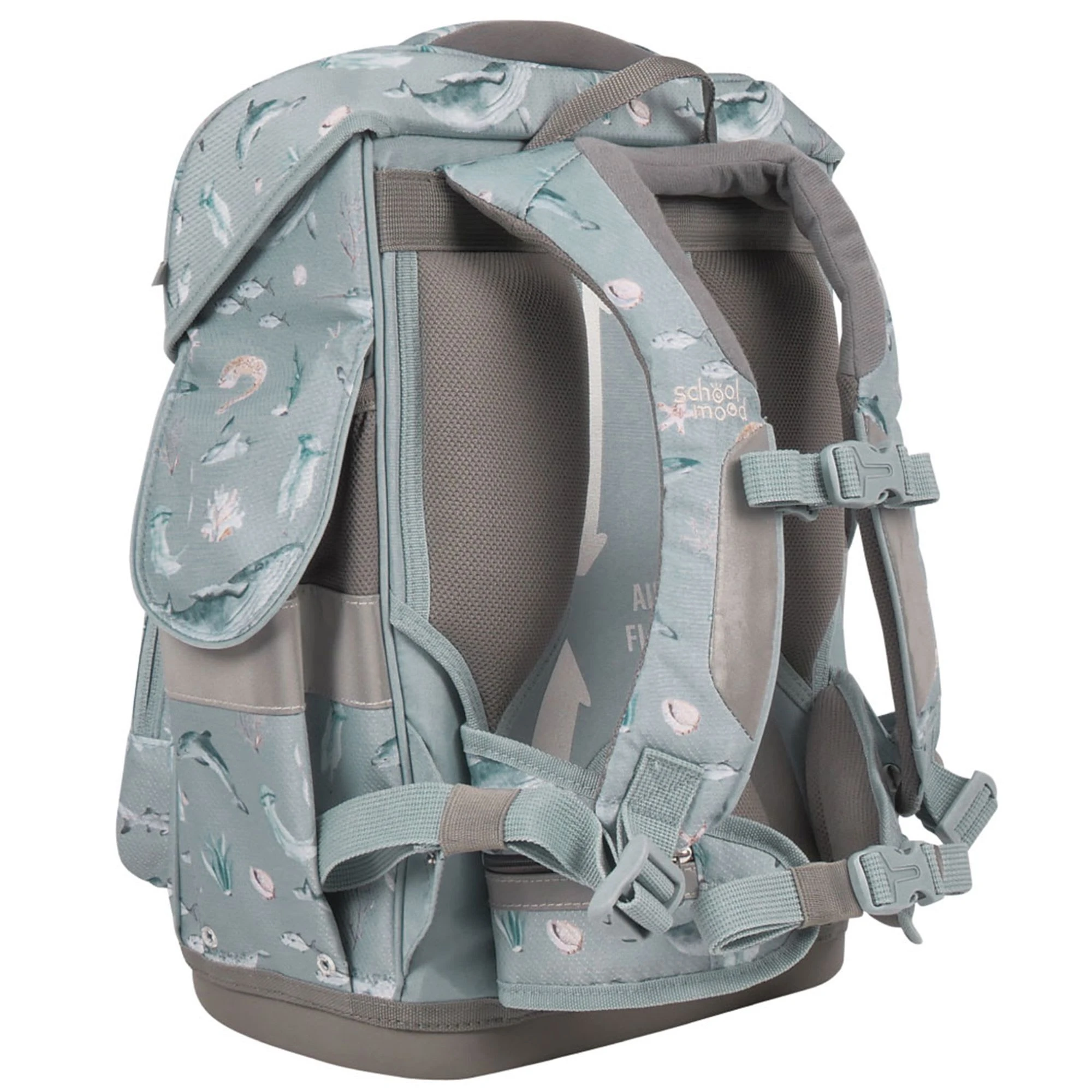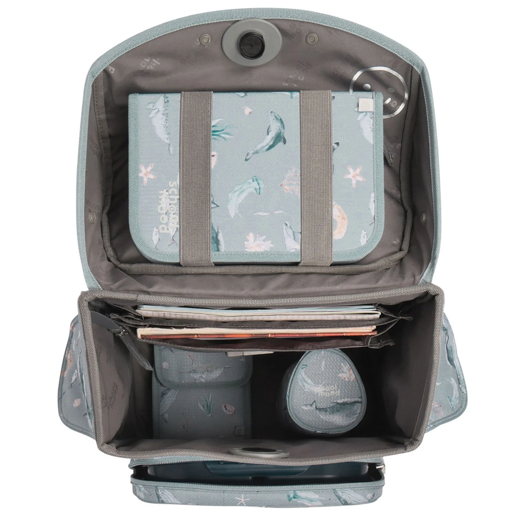 7-teiliges Schulranzen-Set von School-Mood, bestehend aus Schulranzen, Sportbeutel/Turnbeutel, Schüleretui (23-tlg.), Schlamperrolle, Brustbeutel, Brotdose und 3 Patchies. Klassischer Schulranzen der Timeless Air+ Serie ist robust, leicht zu reinigen und lässt keine Wunsche offen. Selbstschließender Magnetverschluss ermöglicht ein kinderleichtes Öffnen und Schließen des Deckels. Das mitwachsende, ergonomisch geformte Tragesystem mit Brust- und Beckengurt bietet hervorragenden Tragekomfort und optimalen Sitz. Im Inneren ist der Schulranzen bestens ausgestattet und bietet Ordnung, Übersicht und viel Stauraum für Hefte, Bücher, Federmäppchen, Brotdose usw. Reflektierende Elemente sorgen für Sicherheit bei Dunkelheit. Mit wechselbaren Patchies für Motivaustausch lässt sich der Schulranzen immer neu und individuell gestalten. Dank integrierter Halterung kann der Sportbeutel am Schulranzen befestigt werden. Etui ist komplett bestückt (21tlg.) und verfügt über einen Stundenplan.