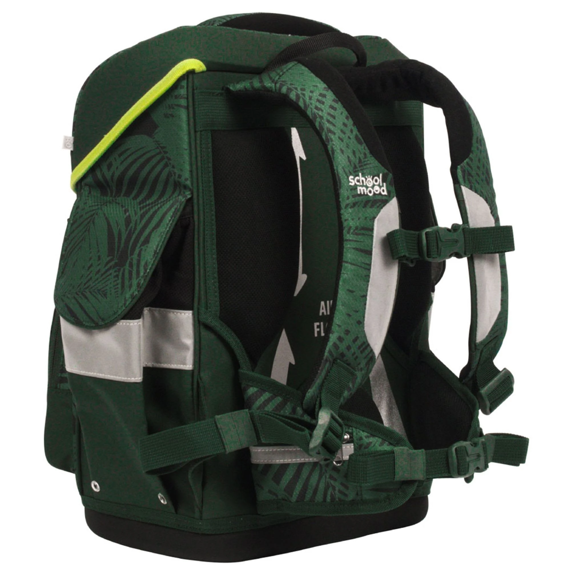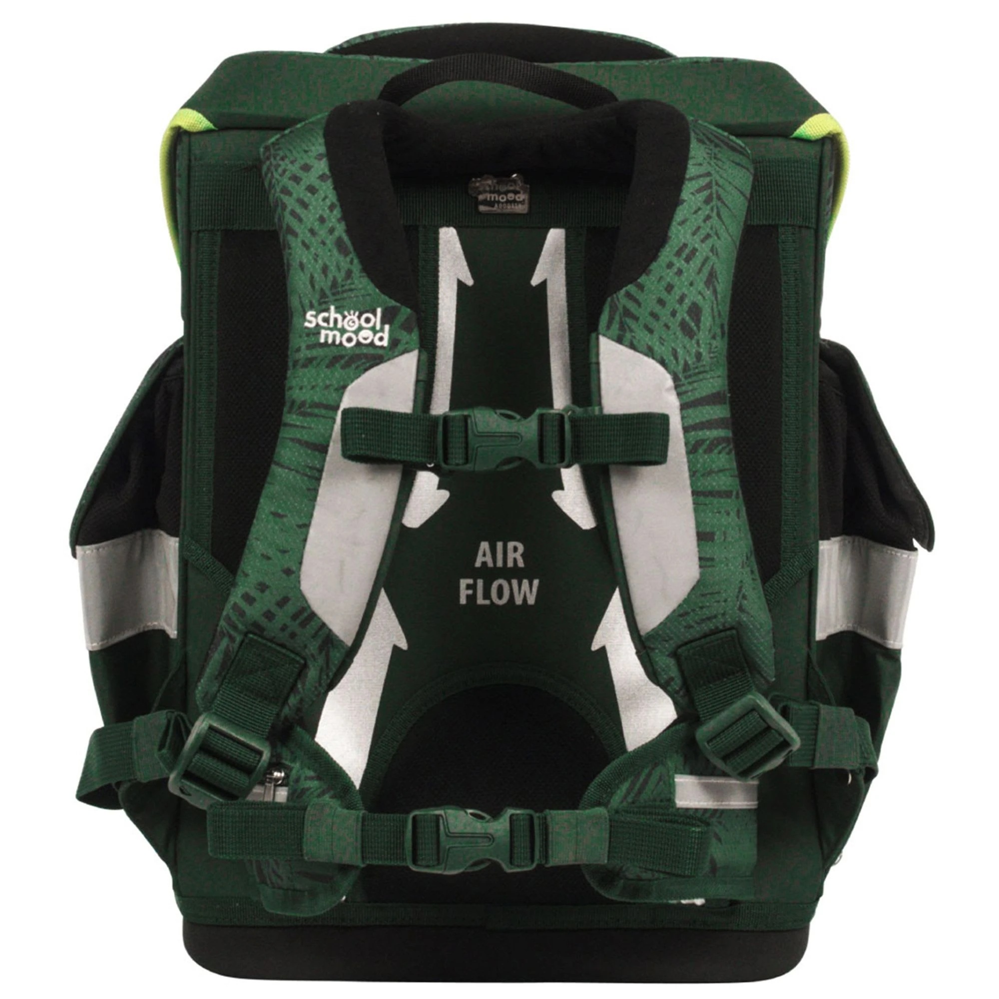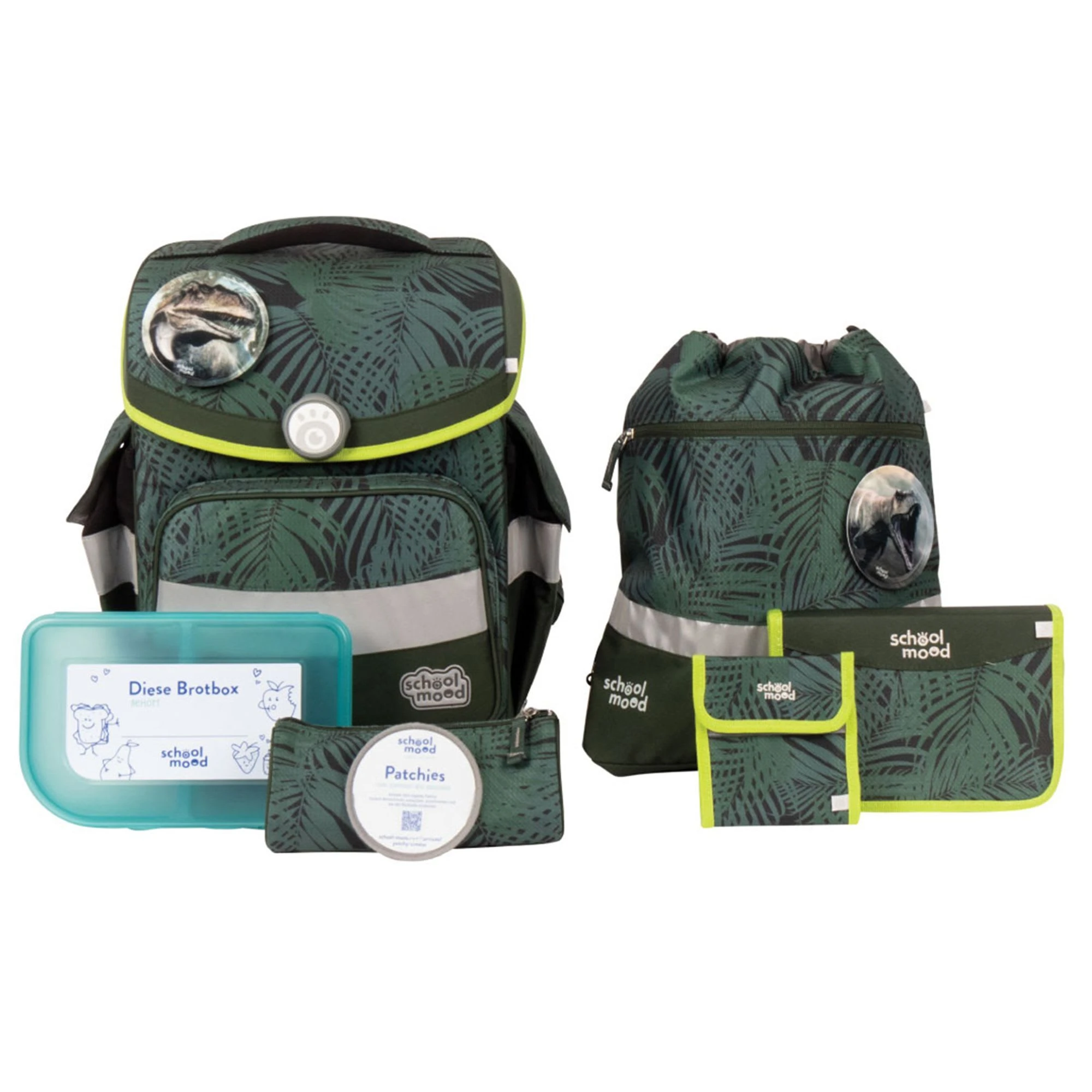 7-teiliges Schulranzen-Set von School-Mood, bestehend aus Schulranzen, Sportbeutel/Turnbeutel, Schüleretui (23-tlg.), Schlamperrolle, Brustbeutel, Brotdose und 3 Patchies. Klassischer Schulranzen der Timeless Air+ Serie ist robust, leicht zu reinigen und lässt keine Wunsche offen. Selbstschließender Magnetverschluss ermöglicht ein kinderleichtes Öffnen und Schließen des Deckels. Das mitwachsende, ergonomisch geformte Tragesystem mit Brust- und Beckengurt bietet hervorragenden Tragekomfort und optimalen Sitz. Im Inneren ist der Schulranzen bestens ausgestattet und bietet Ordnung, Übersicht und viel Stauraum für Hefte, Bücher, Federmäppchen, Brotdose usw. Reflektierende Elemente sorgen für Sicherheit bei Dunkelheit. Mit wechselbaren Patchies für Motivaustausch lässt sich der Schulranzen immer neu und individuell gestalten. Dank integrierter Halterung kann der Sportbeutel am Schulranzen befestigt werden. Etui ist komplett bestückt (21tlg.) und verfügt über einen Stundenplan.