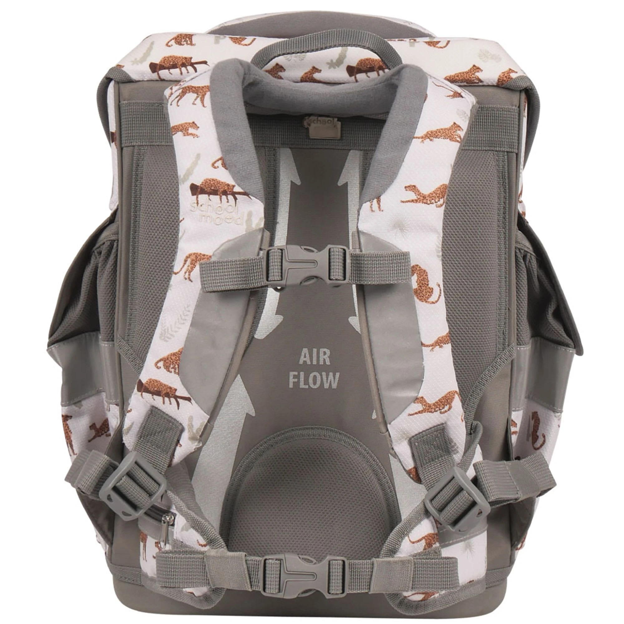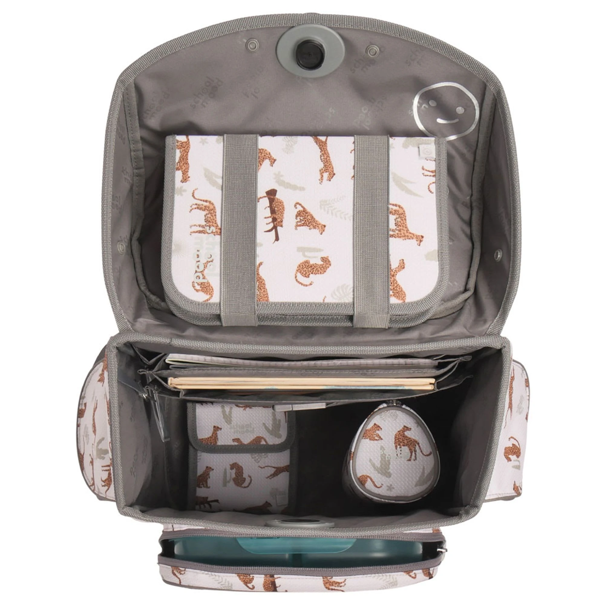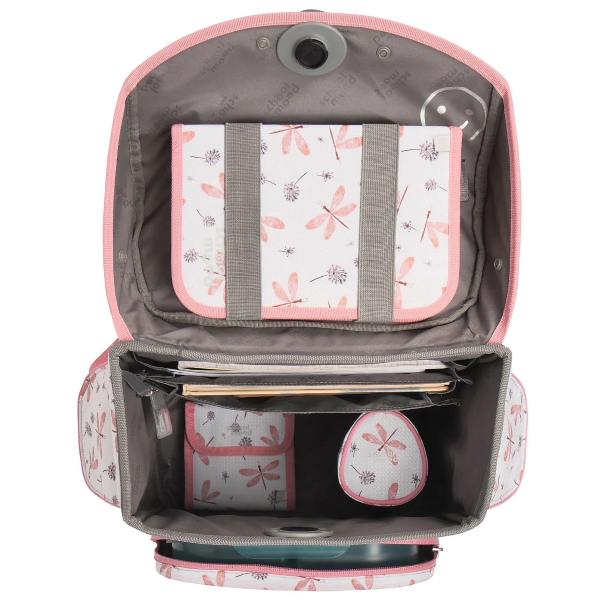 7-teiliges Schulranzen-Set von School-Mood, bestehend aus Schulranzen, Sportbeutel/Turnbeutel, Schüleretui (23-tlg.), Schlamperrolle, Brustbeutel, Brotdose und 3 Patchies. Klassischer Schulranzen der Timeless Air+ Serie ist robust, leicht zu reinigen und lässt keine Wunsche offen. Selbstschließender Magnetverschluss ermöglicht ein kinderleichtes Öffnen und Schließen des Deckels. Das mitwachsende, ergonomisch geformte Tragesystem mit Brust- und Beckengurt bietet hervorragenden Tragekomfort und optimalen Sitz. Im Inneren ist der Schulranzen bestens ausgestattet und bietet Ordnung, Übersicht und viel Stauraum für Hefte, Bücher, Federmäppchen, Brotdose usw. Reflektierende Elemente sorgen für Sicherheit bei Dunkelheit. Mit wechselbaren Patchies für Motivaustausch lässt sich der Schulranzen immer neu und individuell gestalten. Dank integrierter Halterung kann der Sportbeutel am Schulranzen befestigt werden. Etui ist komplett bestückt (21tlg.) und verfügt über einen Stundenplan.