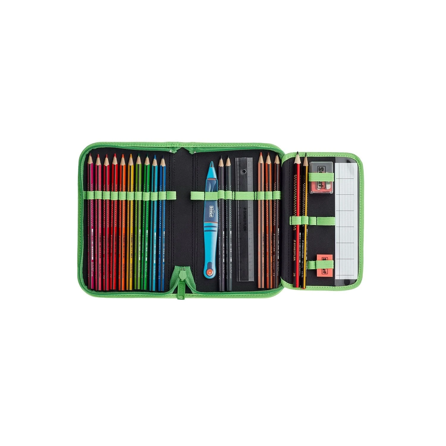 Der Grundschulranzen kommt im 4-teiligen Set mit Sportbeutel, Federmäppchen inklusive Staedtler Qualitätsstiften, Schlamper-Etui sowie 3 Funny Snaps. Das Federmäppchen beinhaltet 15 Buntstifte, 2 Bleistifte, Spitzer, Radiergummi, Lineal und einen Stundenplan.