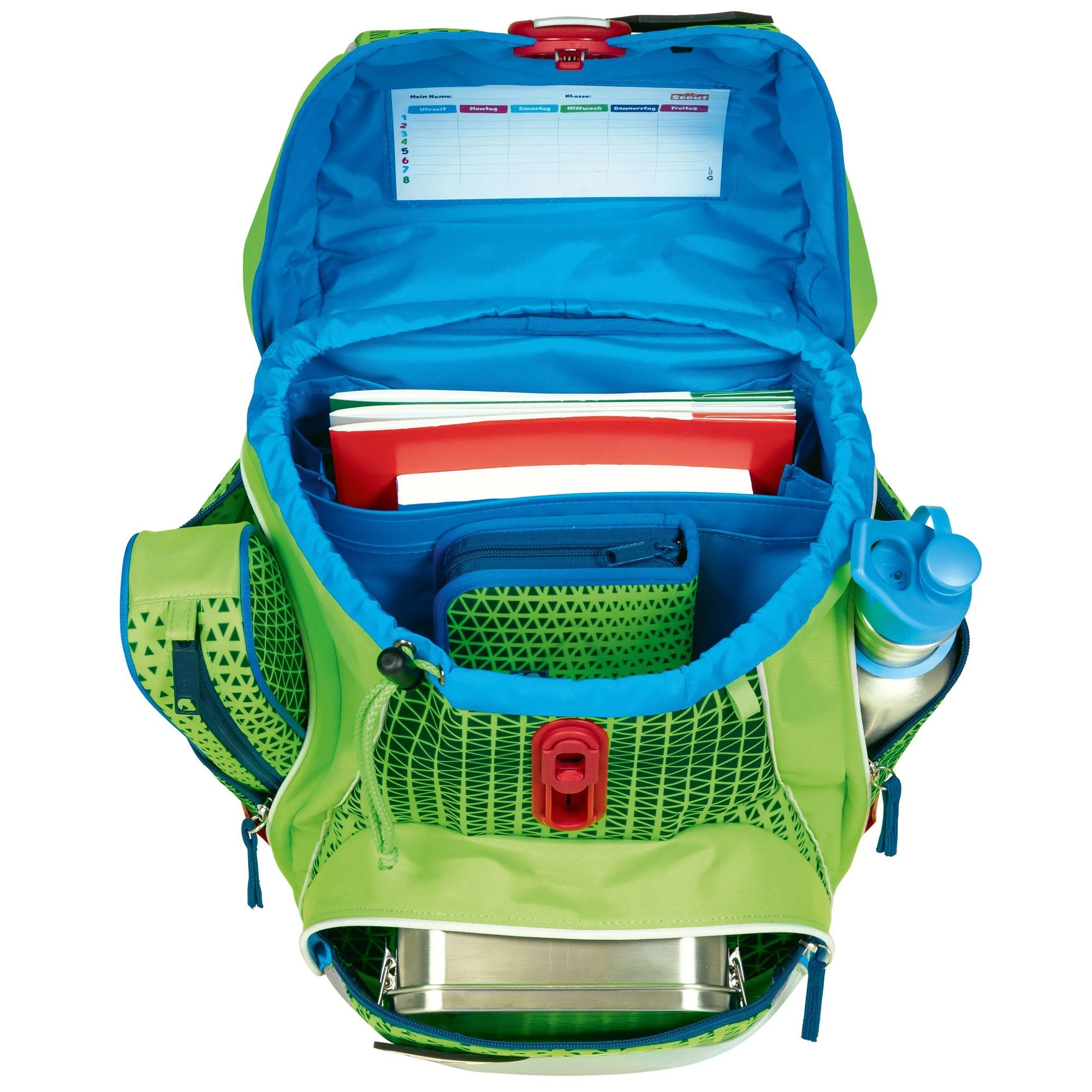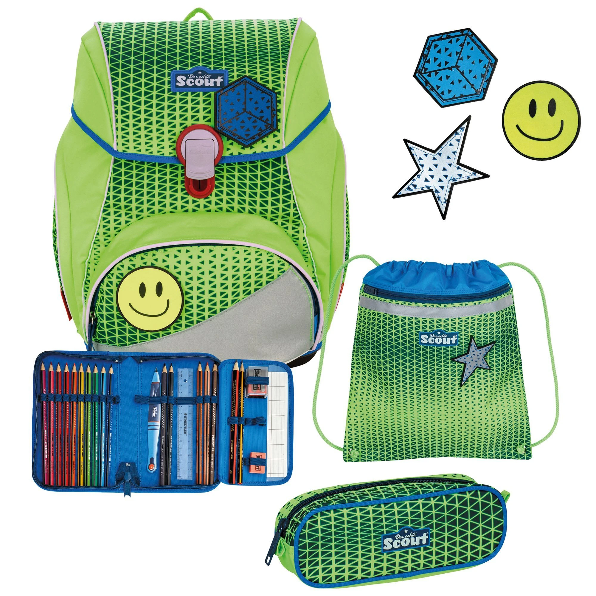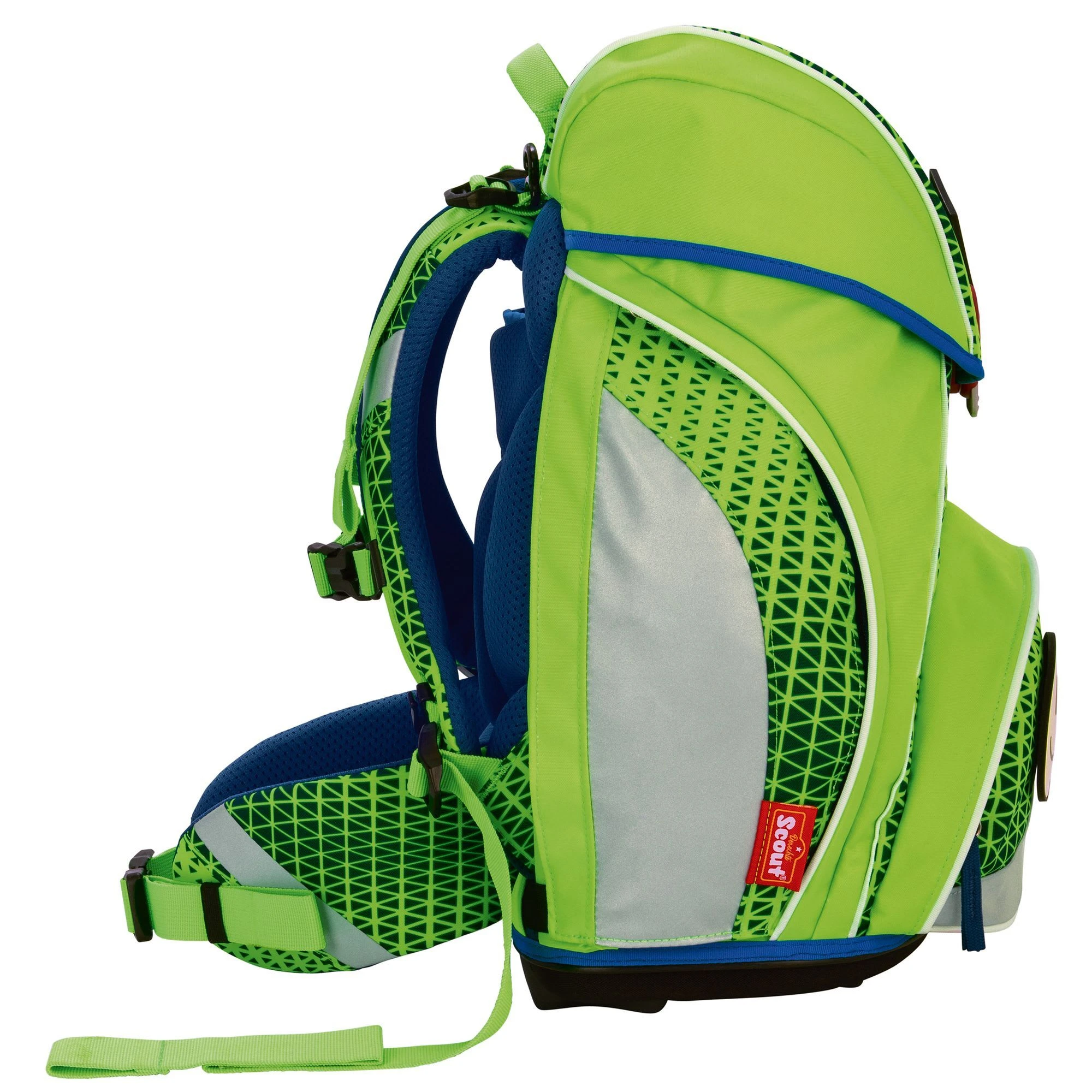 4-teiliges Schulranzen-Set von Scout, bestehend aus Schulranzen, Sportbeutel, Schlamper-Etui und Stifteetui. Top-Tragekomfort durch die atmungsaktive Rückenpolsterung, höhenverstellbaren Gürte sowie Becken- und Brustgurt. Die moderne Rucksackform, Reflektoren bei besserer Sicht in der Dunkelheit und Standfestigkeit sowie Kippsicherheit sind tolle funktionale Eigenschaften des Schulranzens. Die praktischen Seitentaschen wurden so modifiziert, dass die Geräumigkeit erhalten bleibt aber der Ranzen noch schlanker ist.