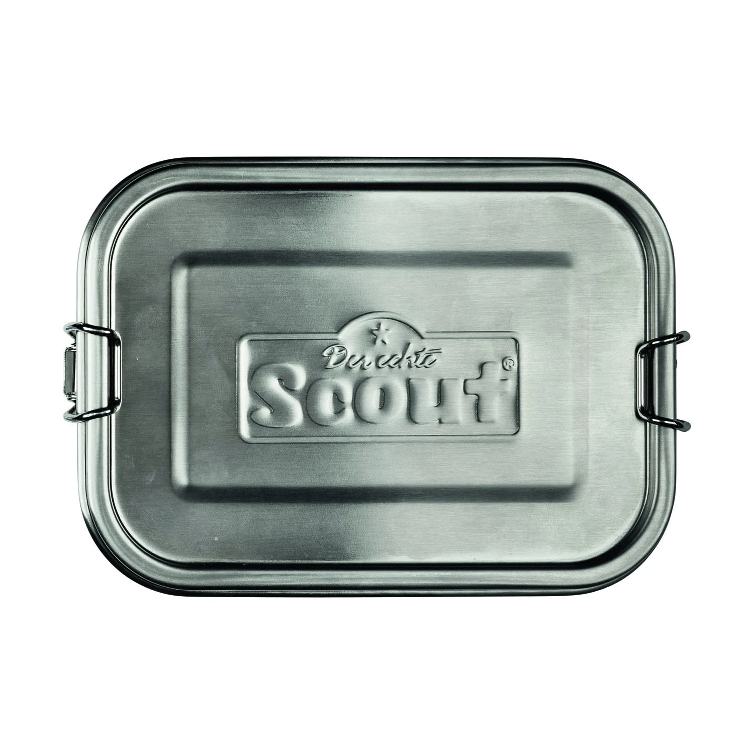 Bruch- und stoßfeste Brotdose von Scout aus robustem Edelstahl mit praktischer herausnehmbarer Trennwand. Sie ist geruchs- sowie geschmacksneutral und zudem dank einer Silikondichtung auslaufsicher.