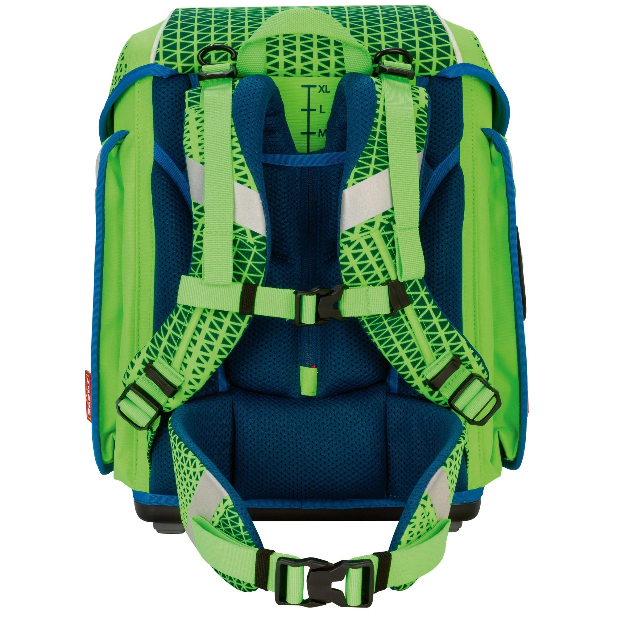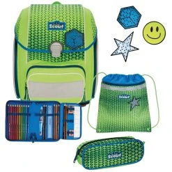 4-teiliges Schulranzen-Set von Scout, bestehend aus Schulranzen, Sportbeutel, Schlamper-Etui und Stifteetui. Top-Tragekomfort durch die atmungsaktive Rückenpolsterung und höhenverstellbaren Gürte wie Becken- und Brustgurt. Die moderne Rucksackform sowie die besonders große Reflektoren (DIN 58124) für bessere Sicht in der Dunkelheit und Standfestigkeit sowie Kippsicherheit durch vier Bodenfüße bieten eine Menge Funktionalität.