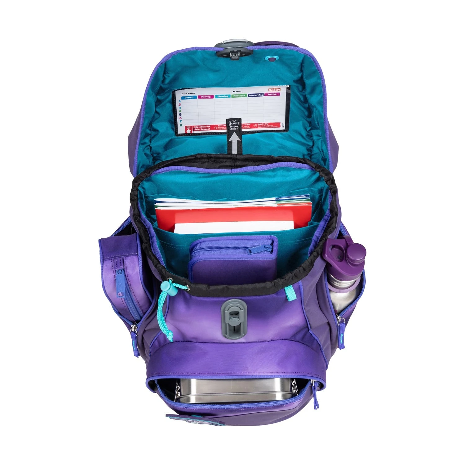 Der Grundschulranzen kommt im 4-teiligen Set mit Sportbeutel, Federmäppchen inklusive Staedtler Qualitätsstiften, Schlamper-Etui, 3 Funny Snaps. Das Federmäppchen beinhaltet 15 Buntstifte, 2 Bleistifte, Spitzer, Radiergummi, Lineal und einen Stundenplan.