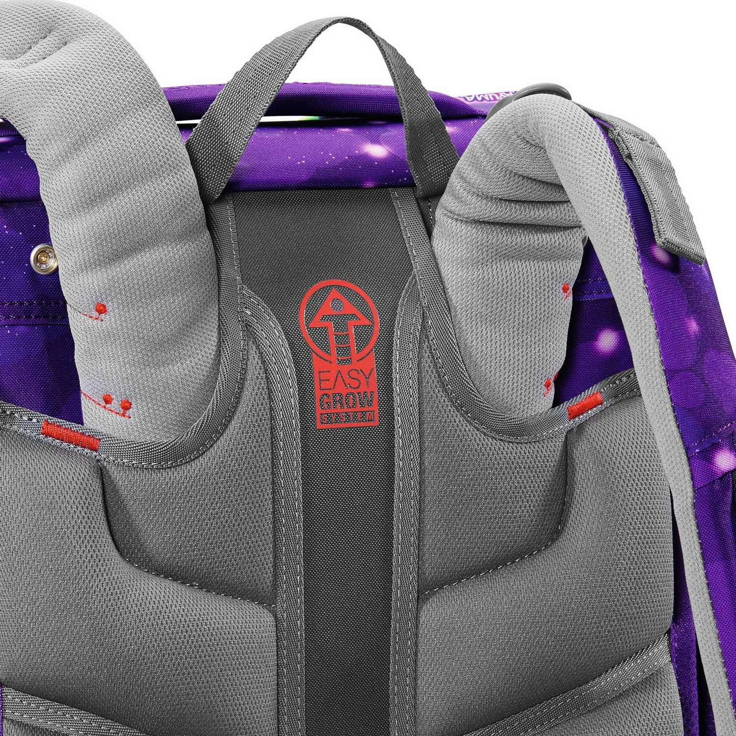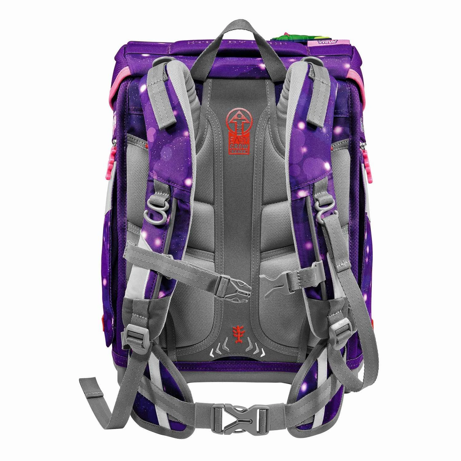 Der Brust- und Hüftgurt ist jeweils höhenverstellbar sowie abnehmbar und stellt sicher, dass das Gewicht des Ranzens von den Schultern genommen und auf den ganzen Körper verteilt wird. Das ergonomisch geformte Rückenpolster ist atmungsaktiv und sorgt hiermit für einen bequemen Sitz und Entlastung in jeder Wachstumsphase.